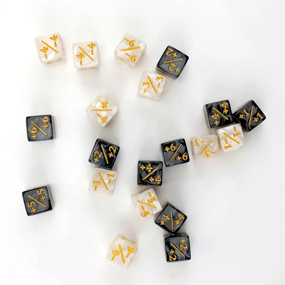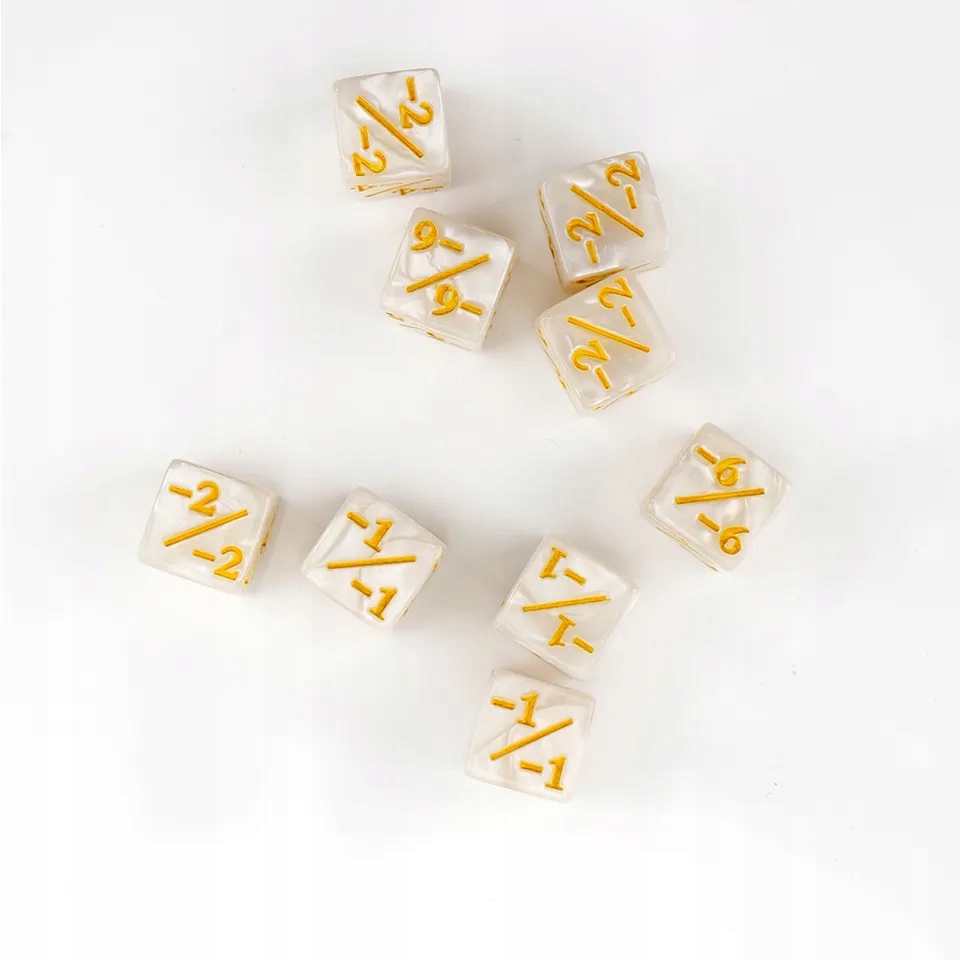 Набор из 10 кубиков — 5 положительных и 5 отрицательных — для игры в Magic: The Gathering (MTG).