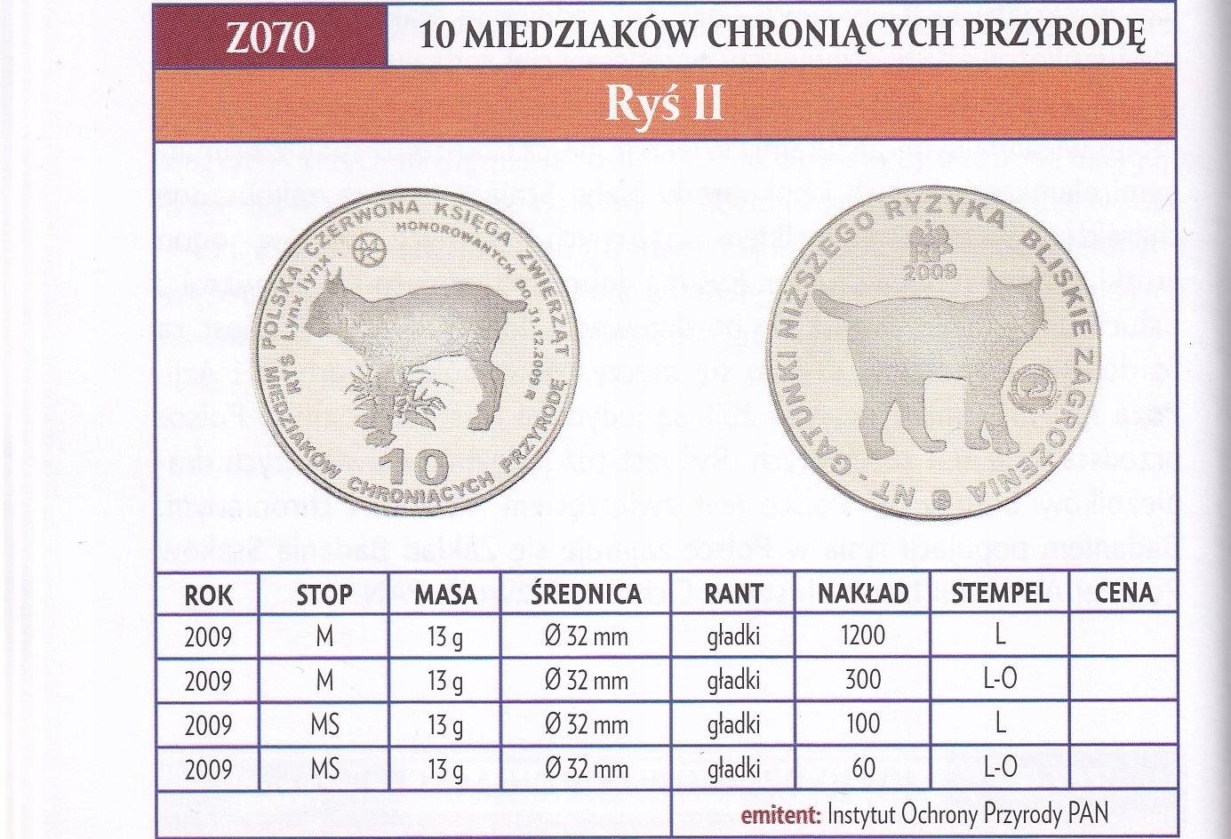 MK070 - 10 МЕДНЫХ ДЕНЕГ, ЗАЩИЩАЮЩИХ ПРИРОДУ - РЫСЬ II - ПОСЕРЕБРЕННЫЕ - 2009 г. MENNICA KRESOWA
