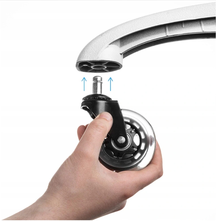 Просто снимите старые колеса с основания стула и вдавите в них ножки новых колес. Для его замены не потребуются никакие инструменты
