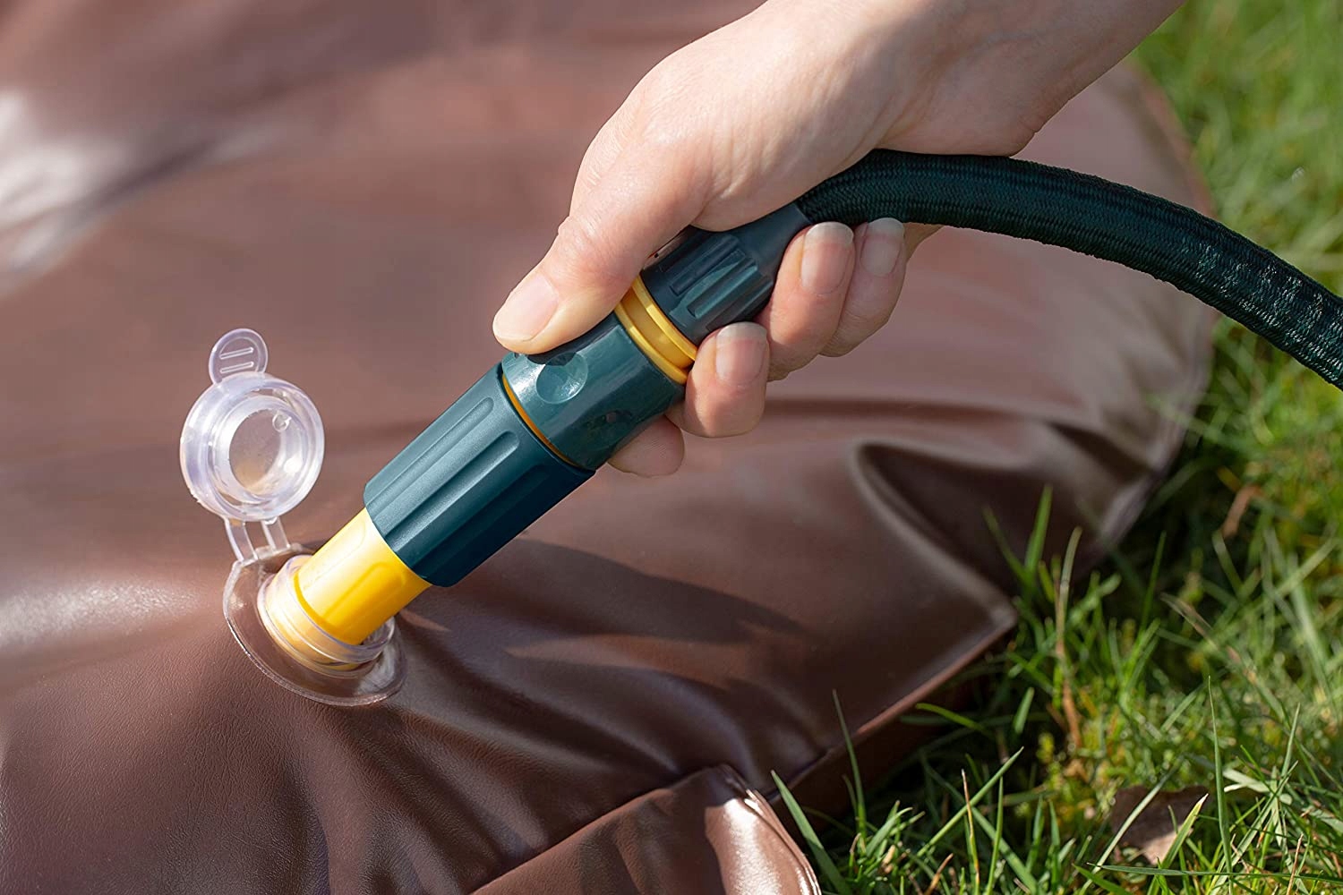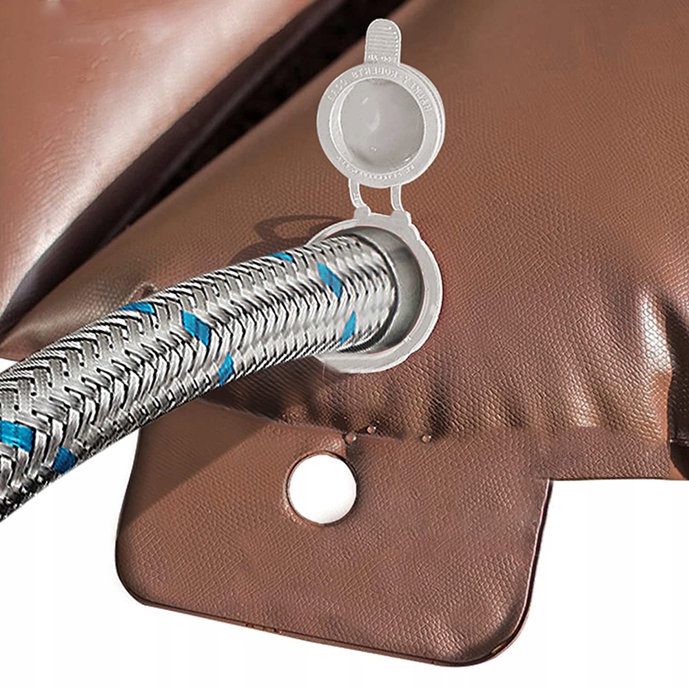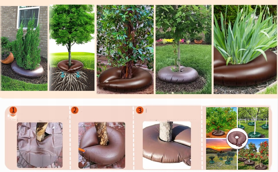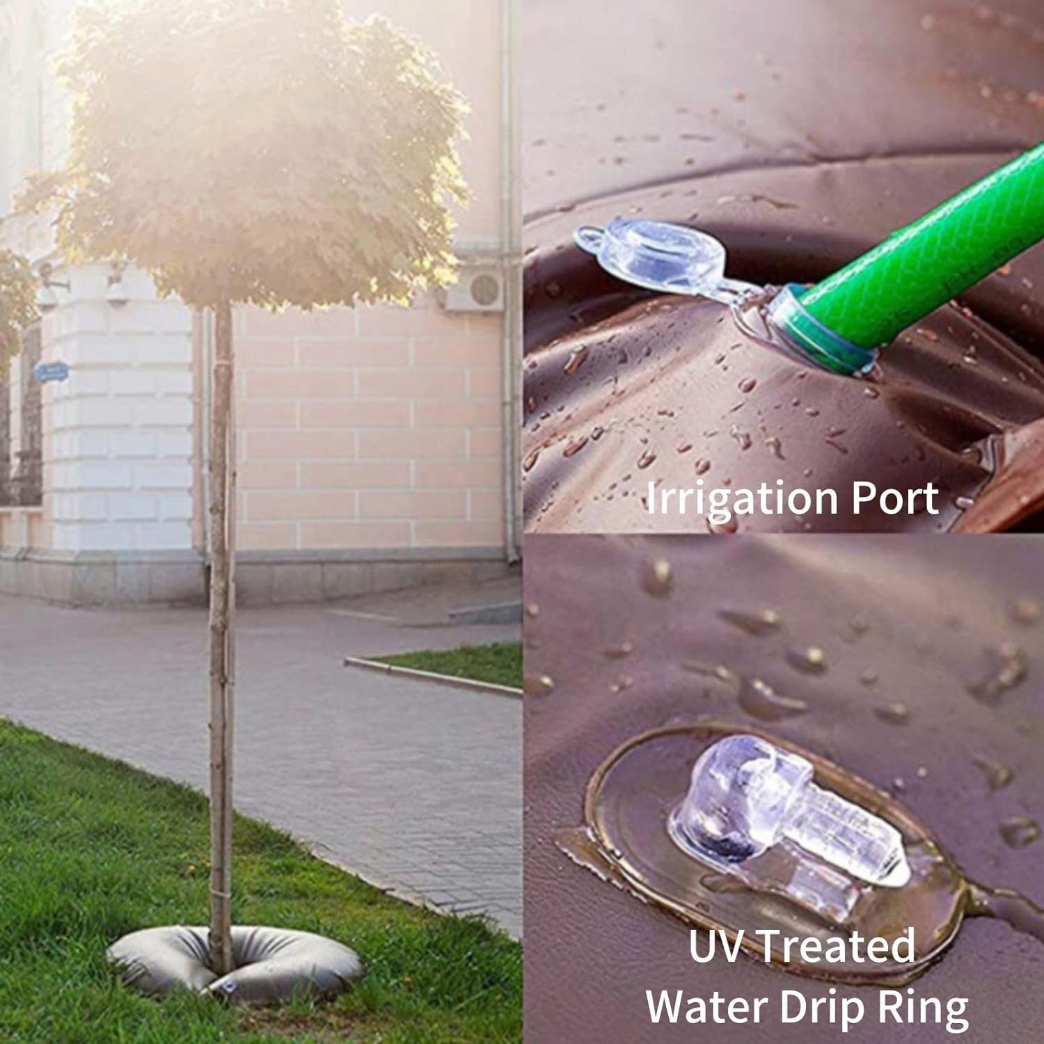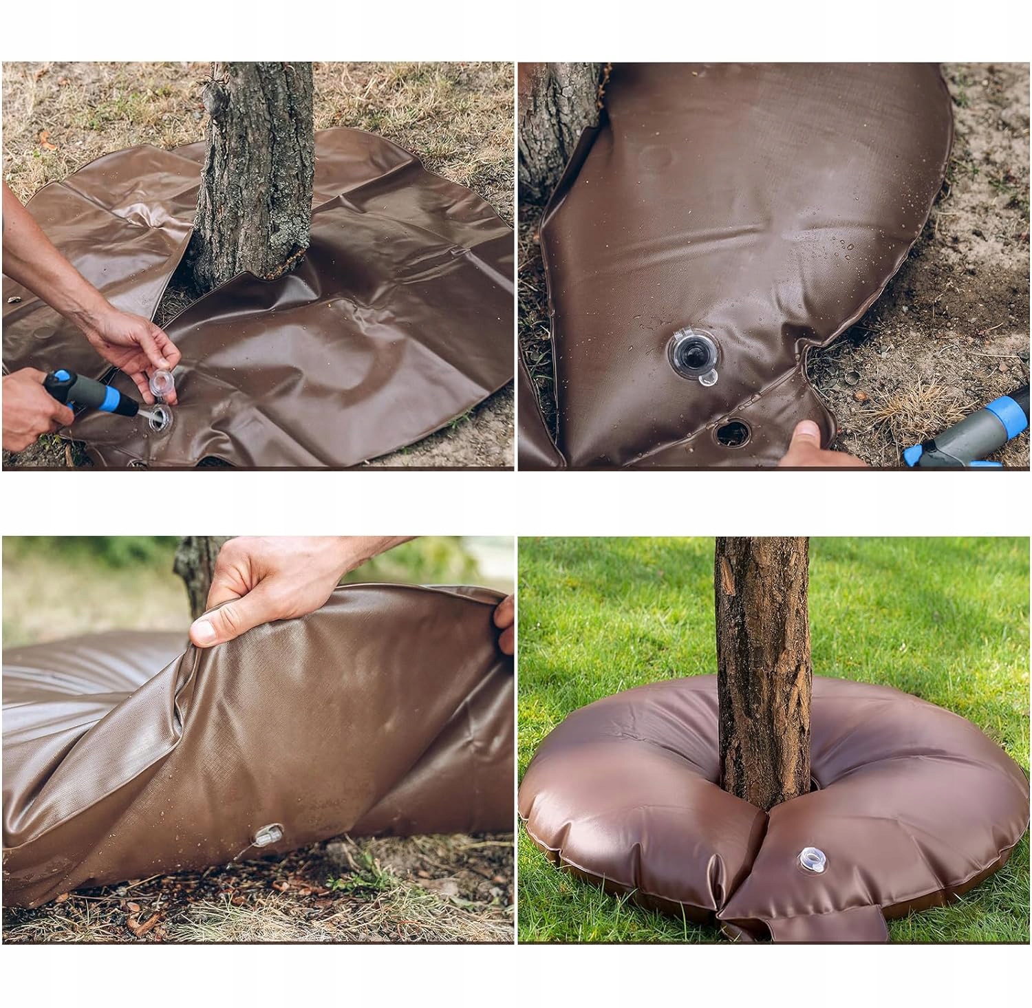 Быстрое и легкое заполнение с помощью садового шланга, просто наполнив шланг через практичное отверстие для подачи воды. Крышка на впускном клапане воды предотвращает утечки. Кольцевой мешок для полива деревьев имеет 2 небольшие насадки, благодаря уникальной форме и 2 дренажным штуцерам для капельного орошения, требуется меньше воды, поливная вода также достигает глубоких корней и не может испаряться.