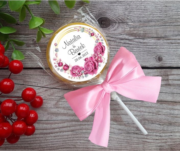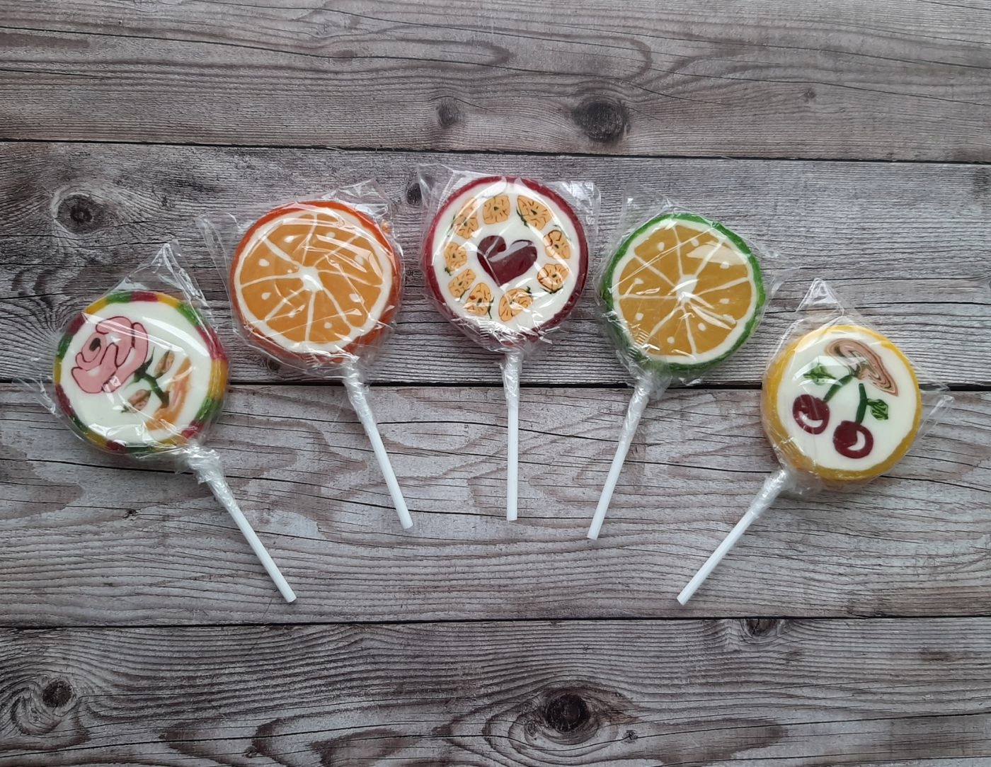 Леденец + наклейка + бантик, все эти товары упакованы в отдельные группы, для самостоятельной сборки (это снижает риск повреждения при транспортировке). После получения продукции следует нанести готовую наклейку и прикрепить бантик самостоятельно. Банты сложены и готовы к закреплению с помощью прозрачной резинки.
