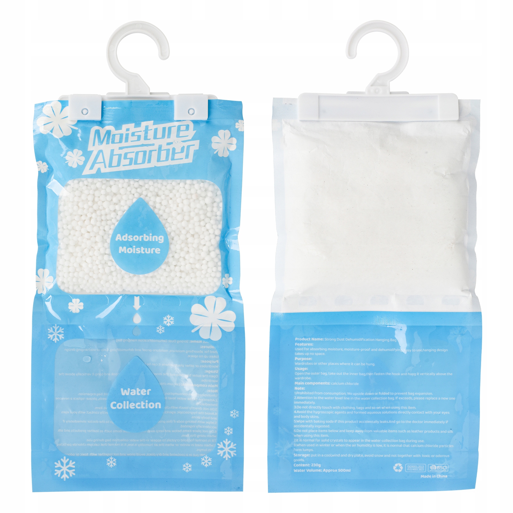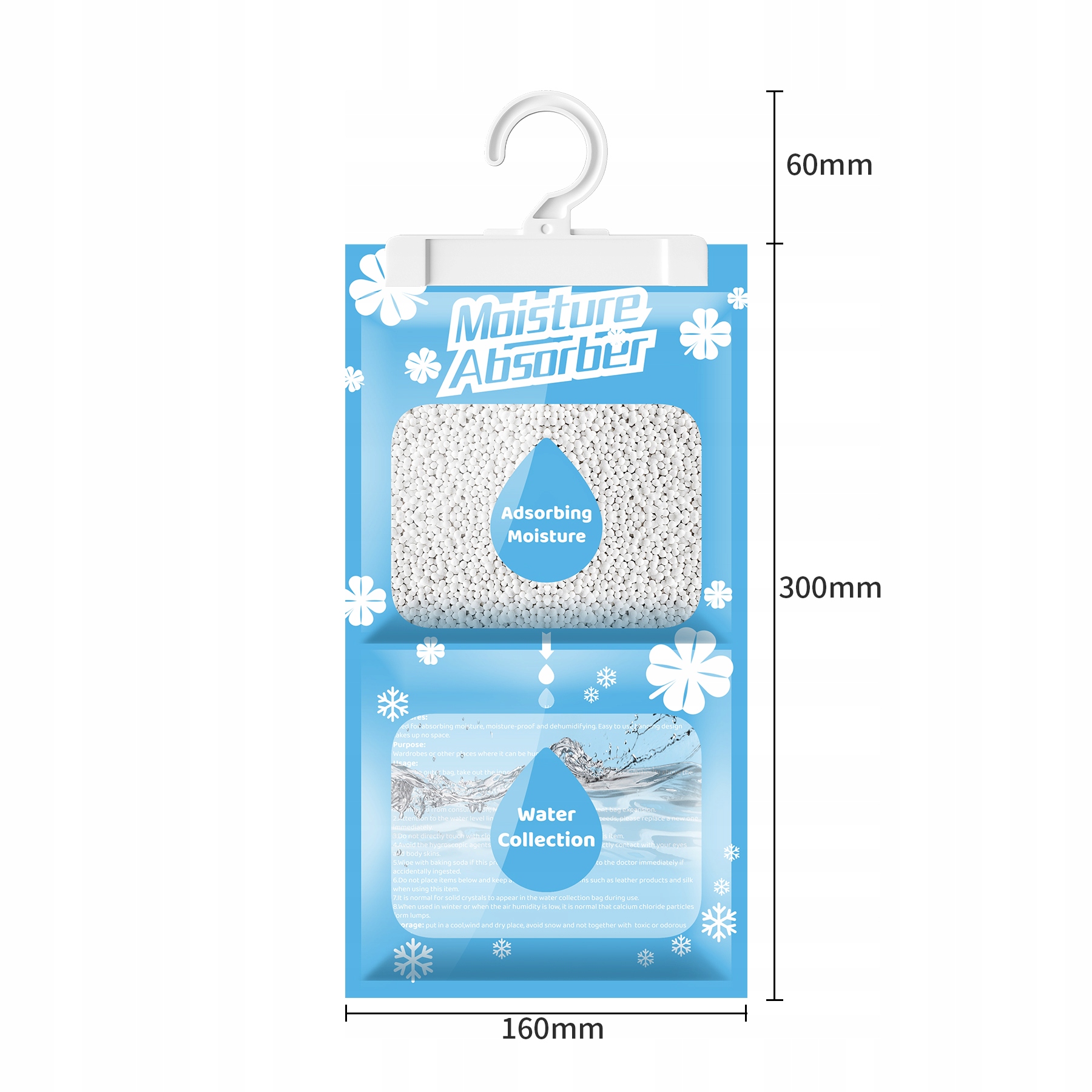 3. Прикрепите крючок к отверстию сумки и повесьте собранную сумку. Повесьте пакет для осушения в том месте, где необходимо осушение, на расстоянии 5-10 см от предметов одежды, чтобы изделие полностью контактировало с воздухом, и держите пакет в вертикальном положении, когда белые частицы полностью исчезнут. растворить, немедленно выбросить и при необходимости заменить новым продуктом.