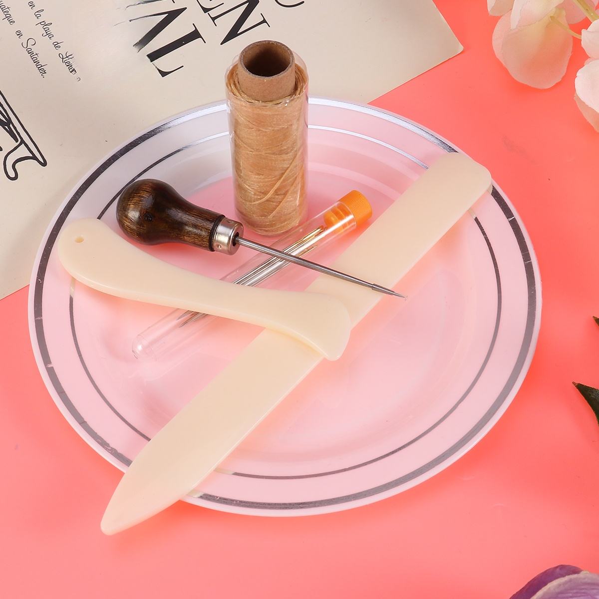✅ Количество: щипцы для костяных папок 2 шт., большие иглы 6 шт. с прозрачной бутылкой, 1 шт. плоские вощеные кусочки нити цвета экрю от шила с деревянной ручкой, всего 11 шт. базового набора переплетных инструментов.