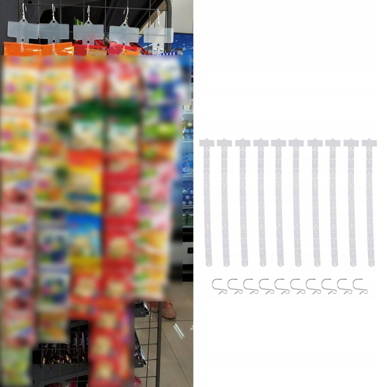 Упаковка: набор из 10 штук подвесных полос с крючками для экспозиции и розничных гаджетов.