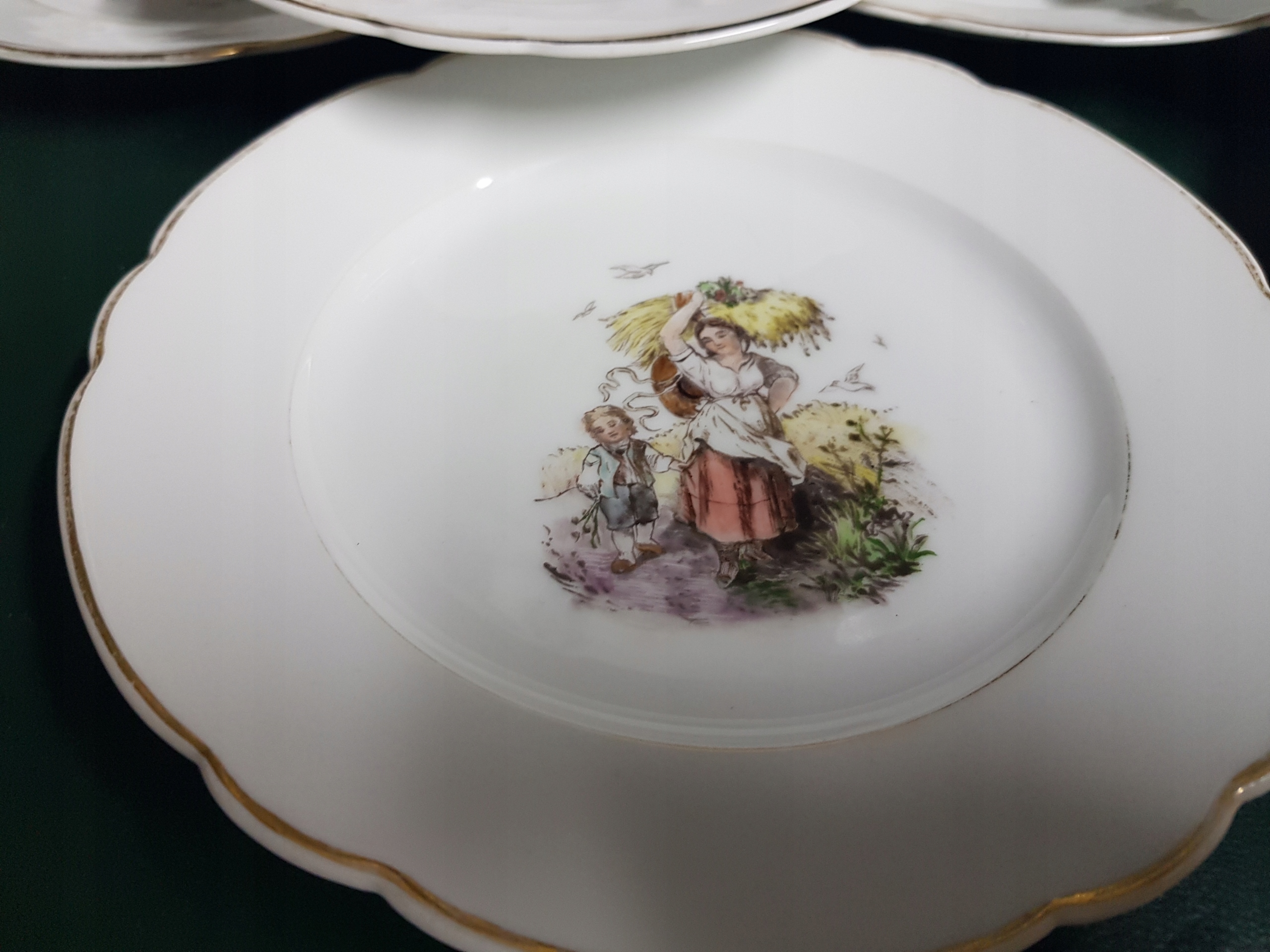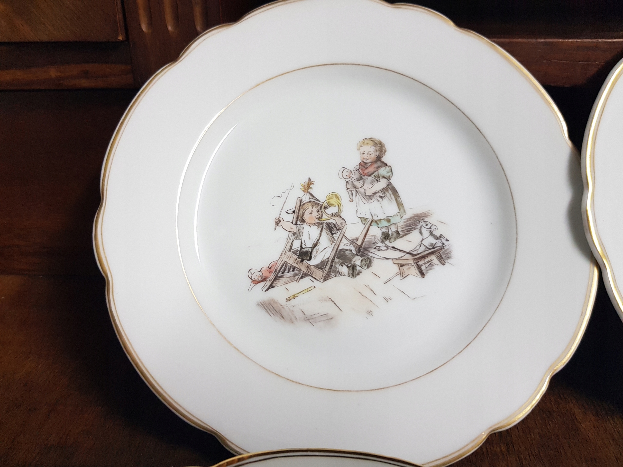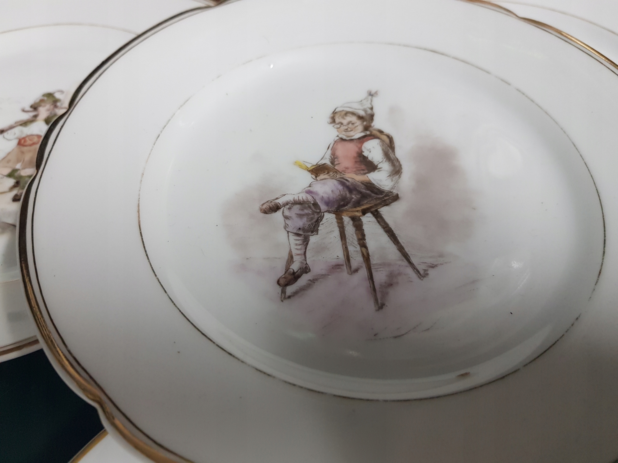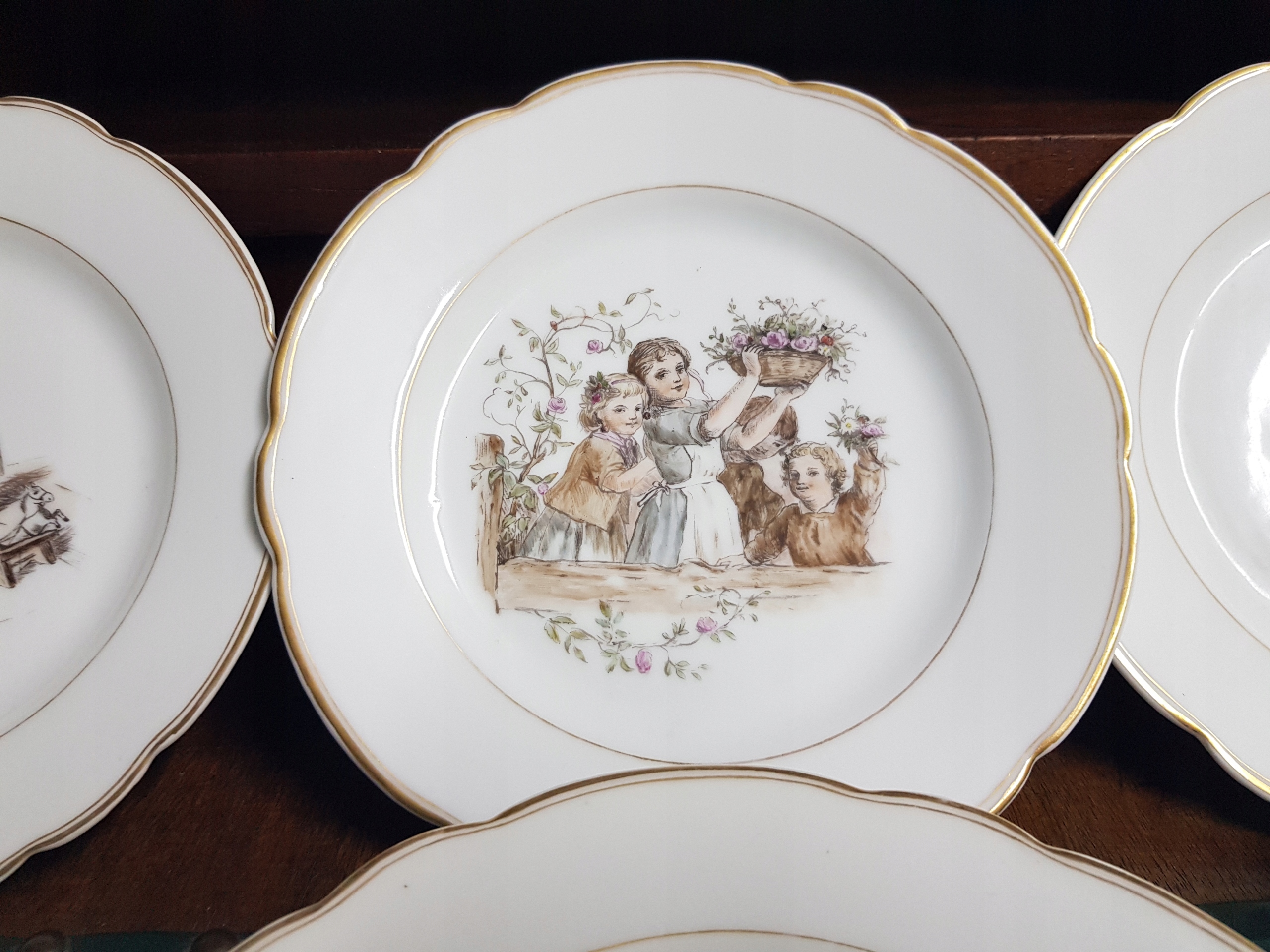 Предмет аукциона - 10 тарелок с ручной росписью. Случайно выбранные тарелки разных размеров и форм. Мотивы детских игр, жанровые сценки. Надписи на двух тарелках с датой 1888 года.