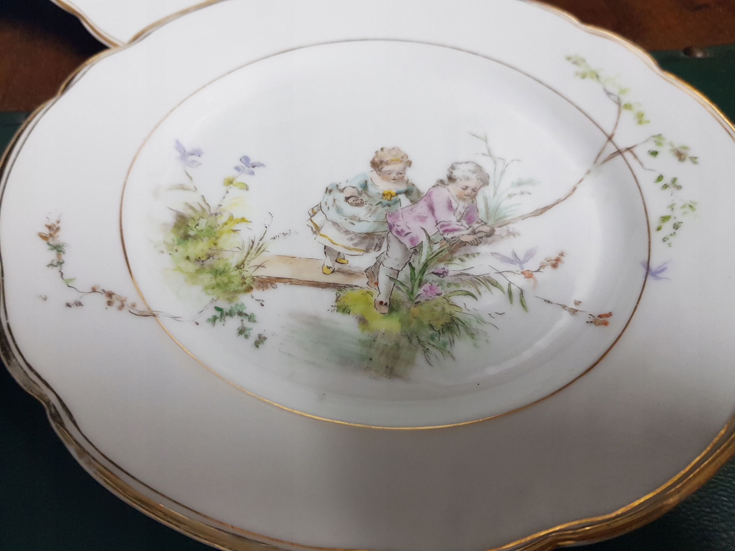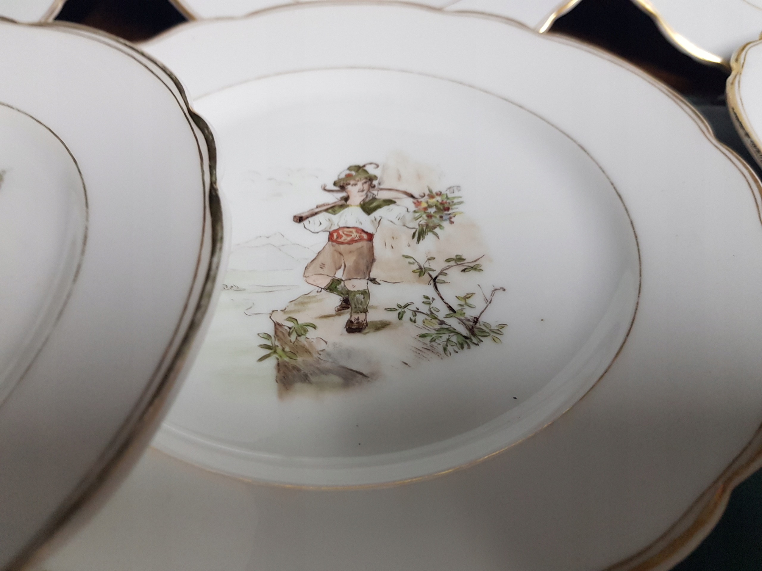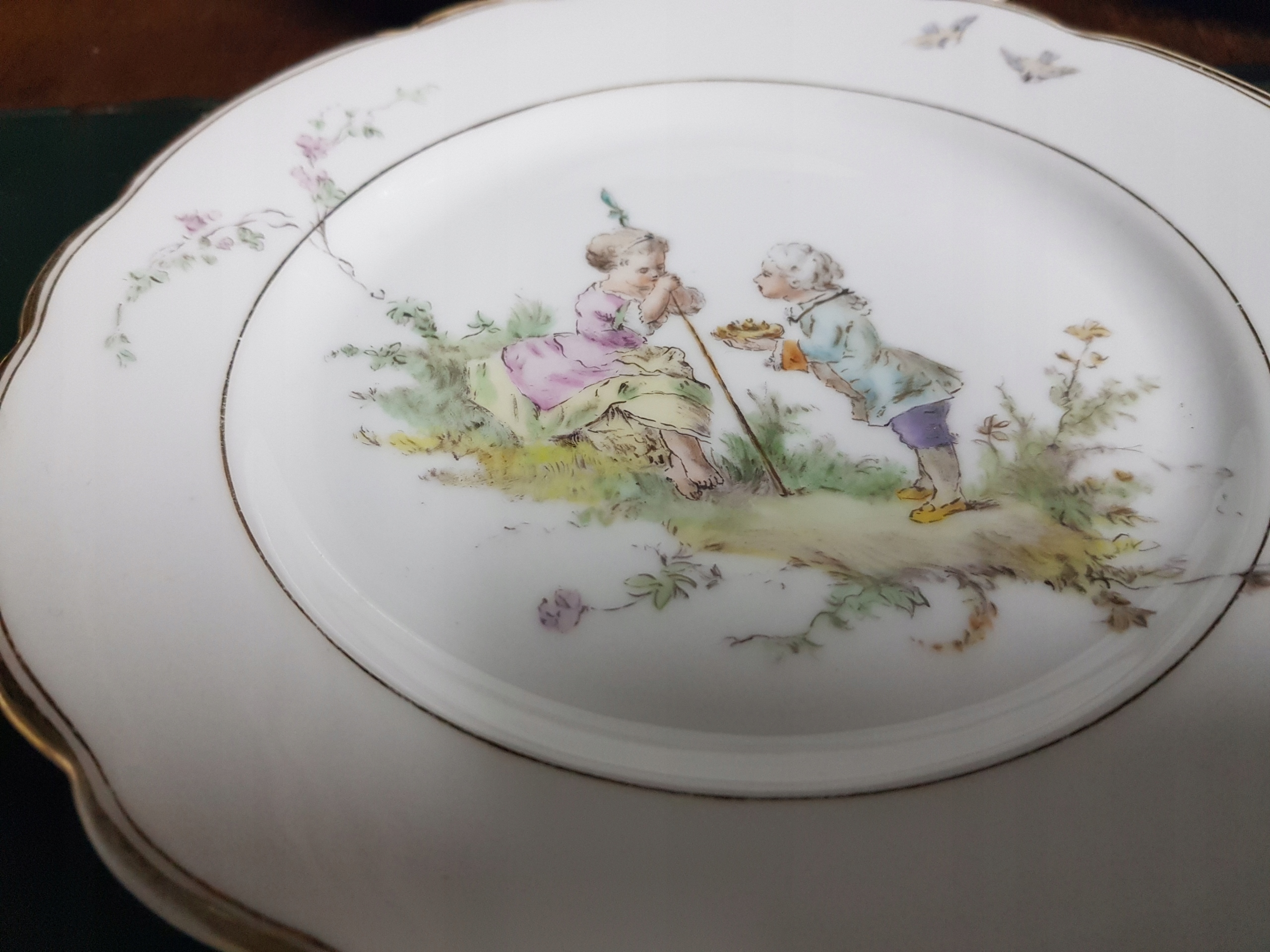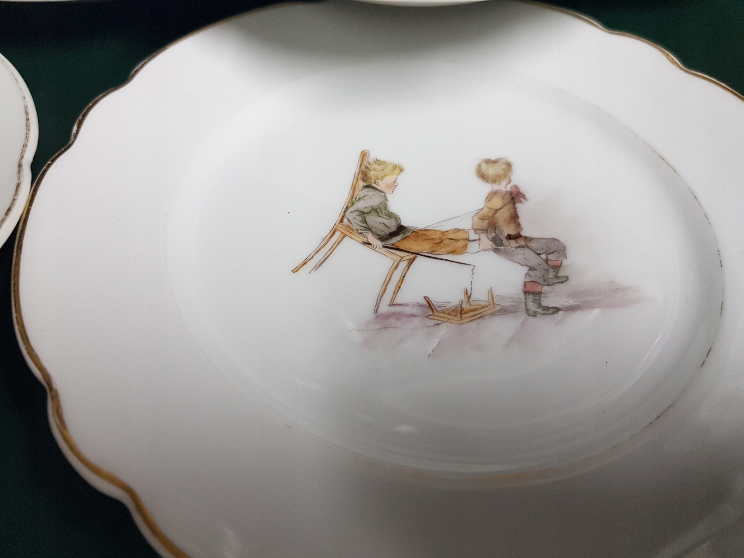 Предмет аукциона - 10 тарелок с ручной росписью. Случайно выбранные тарелки разных размеров и форм. Мотивы детских игр, жанровые сценки. Надписи на двух тарелках с датой 1888 года.