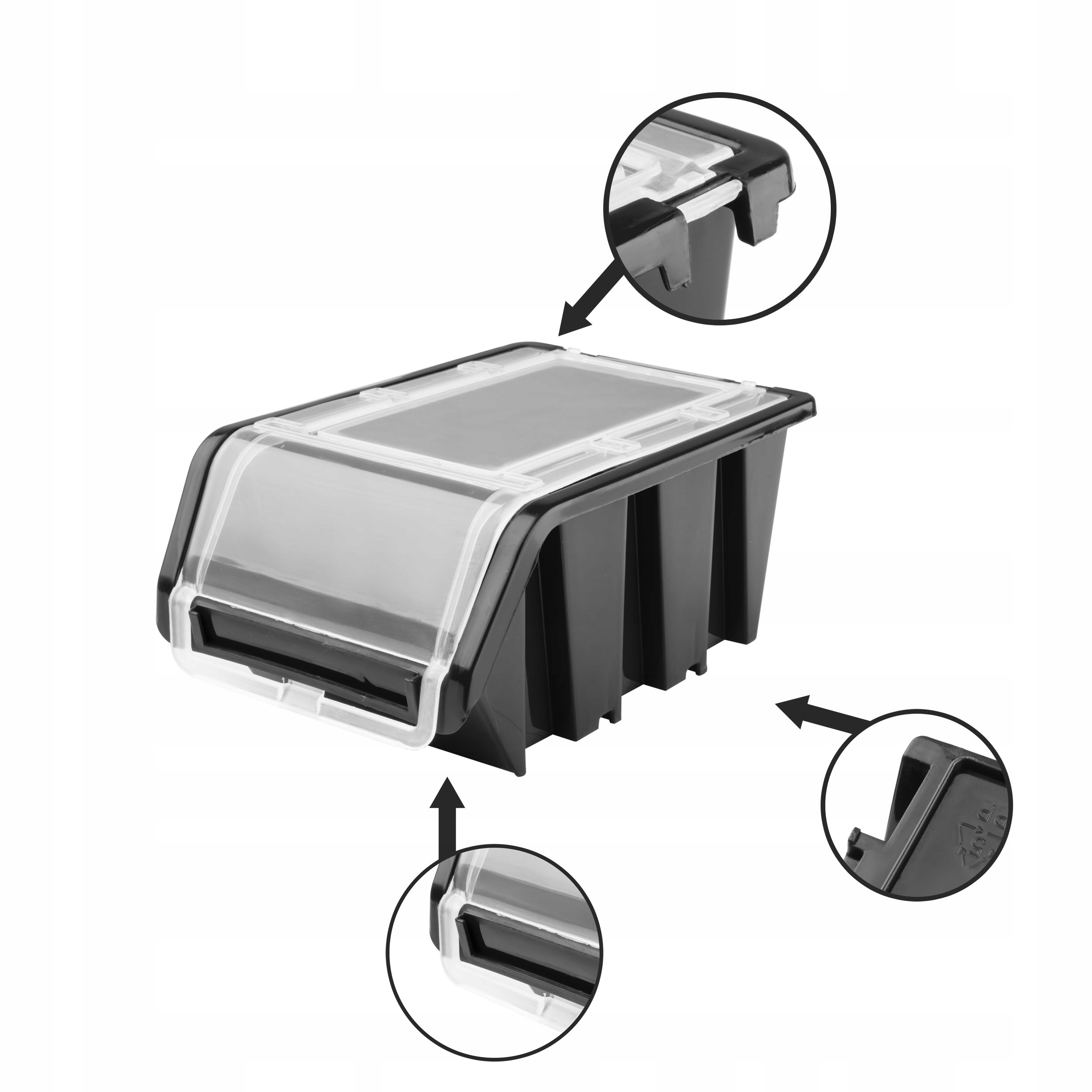 Эргономичная форма контейнеров позволяет штабелировать их. Используемая рама также позволяет их штабелировать, благодаря чему мы можем значительно сэкономить пространство. позицию, улучшите доступ к мелкие элементы. Продуманная конструкция позволяет вставлять по одному контейнеру за раз. во втором. Версия с крышкой обеспечивает пыленепроницаемость и безопасность при транспортировке. Контейнерымогут повеситьна доски для инструментов, имеющиеся в нашем предложении.