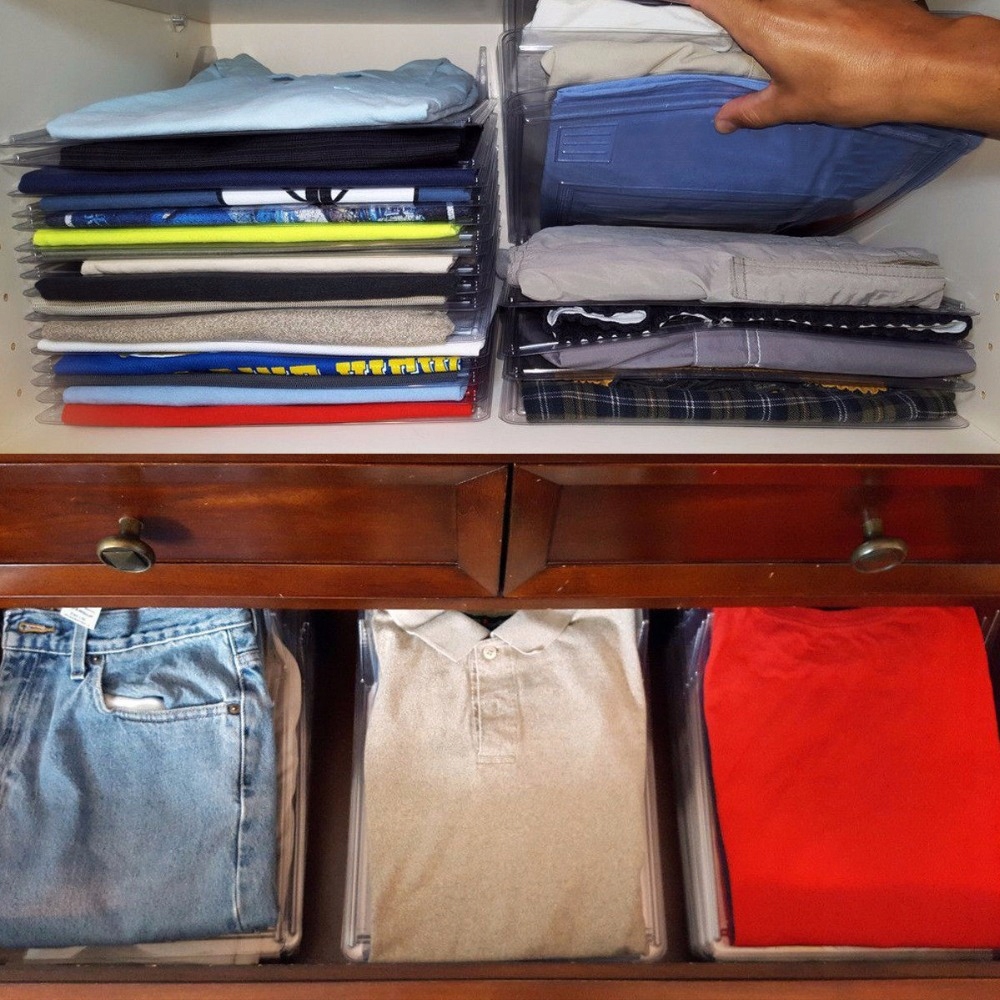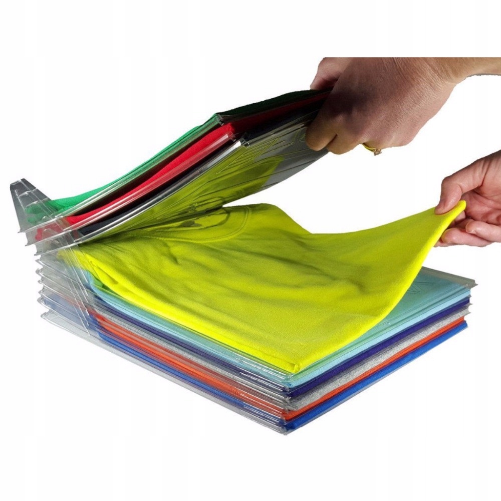 Органайзер позволяет разделять и складывать футболки друг на друга, чтобы, подняв разделитель, можно было легко выбрать и вытащите то, что вам нужно, не потревожив и не испортив кучу остатков футболок. Обеспечивает организацию, видимость, а также быстрый и легкий доступ к каждой футболке в вашей стопке. Упрощает сортировку и штабелирование и получение желаемого.