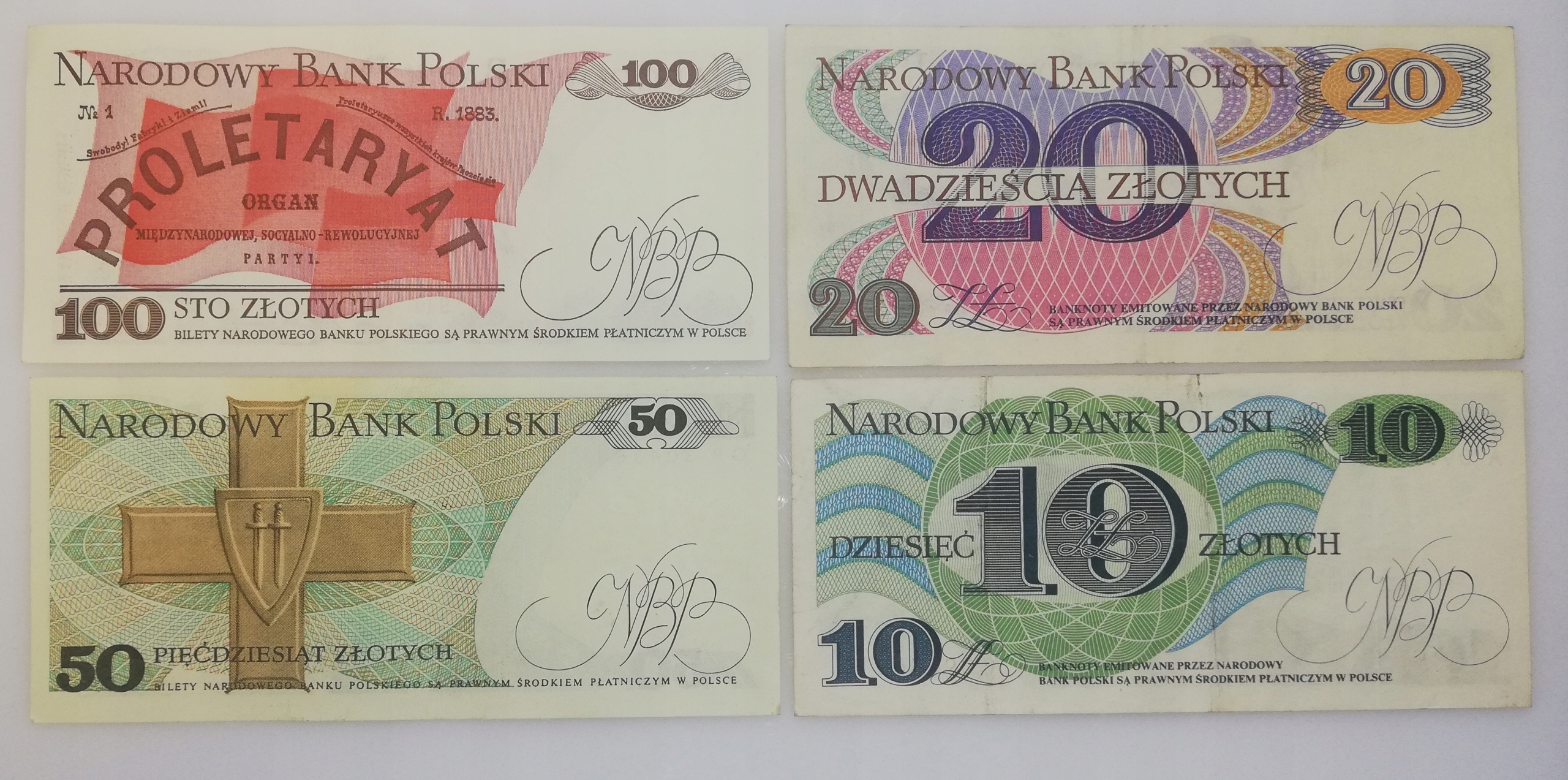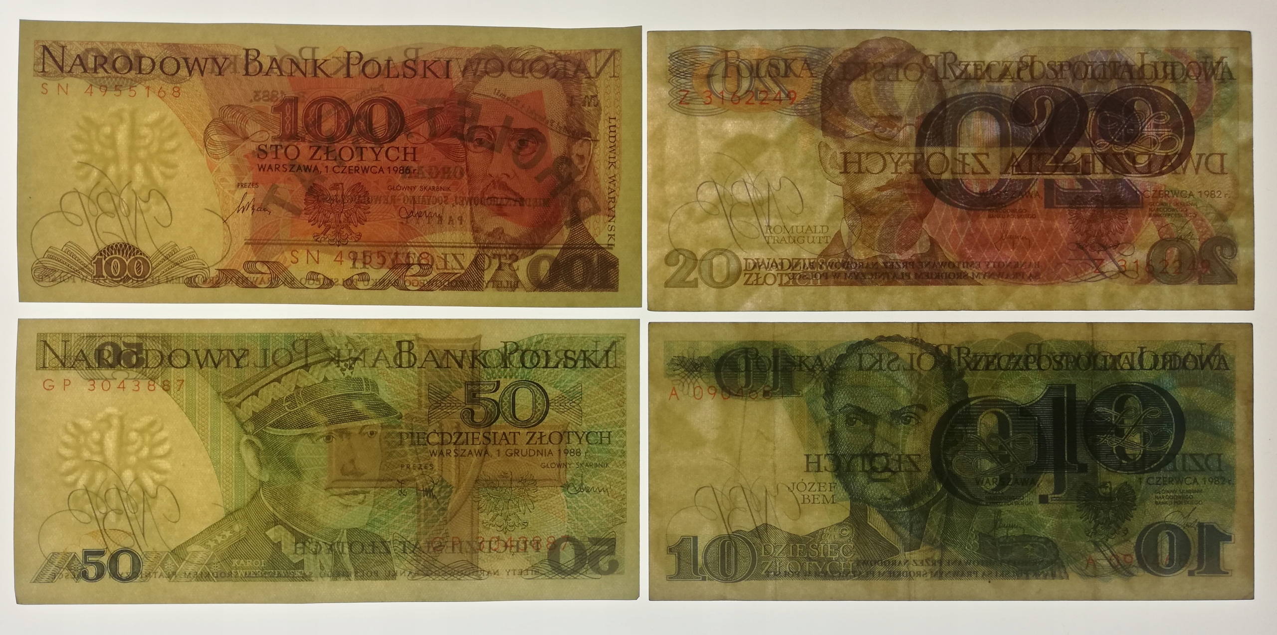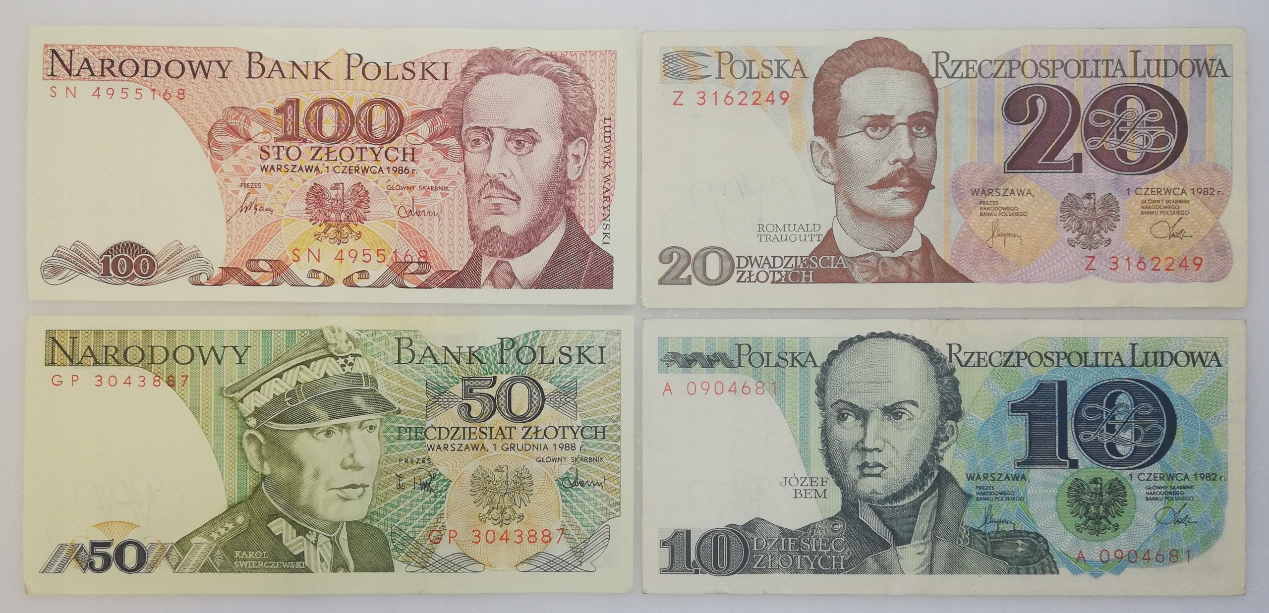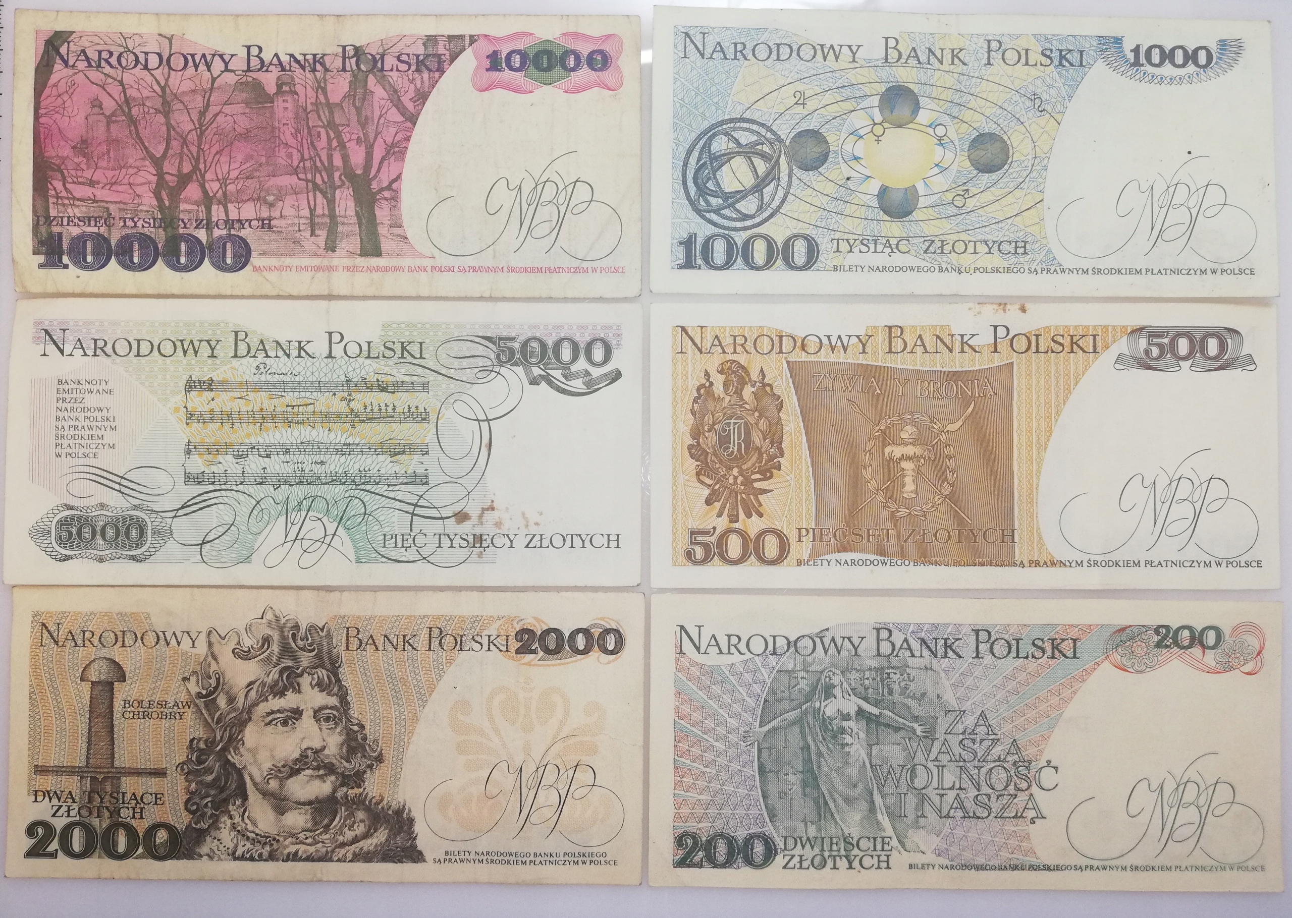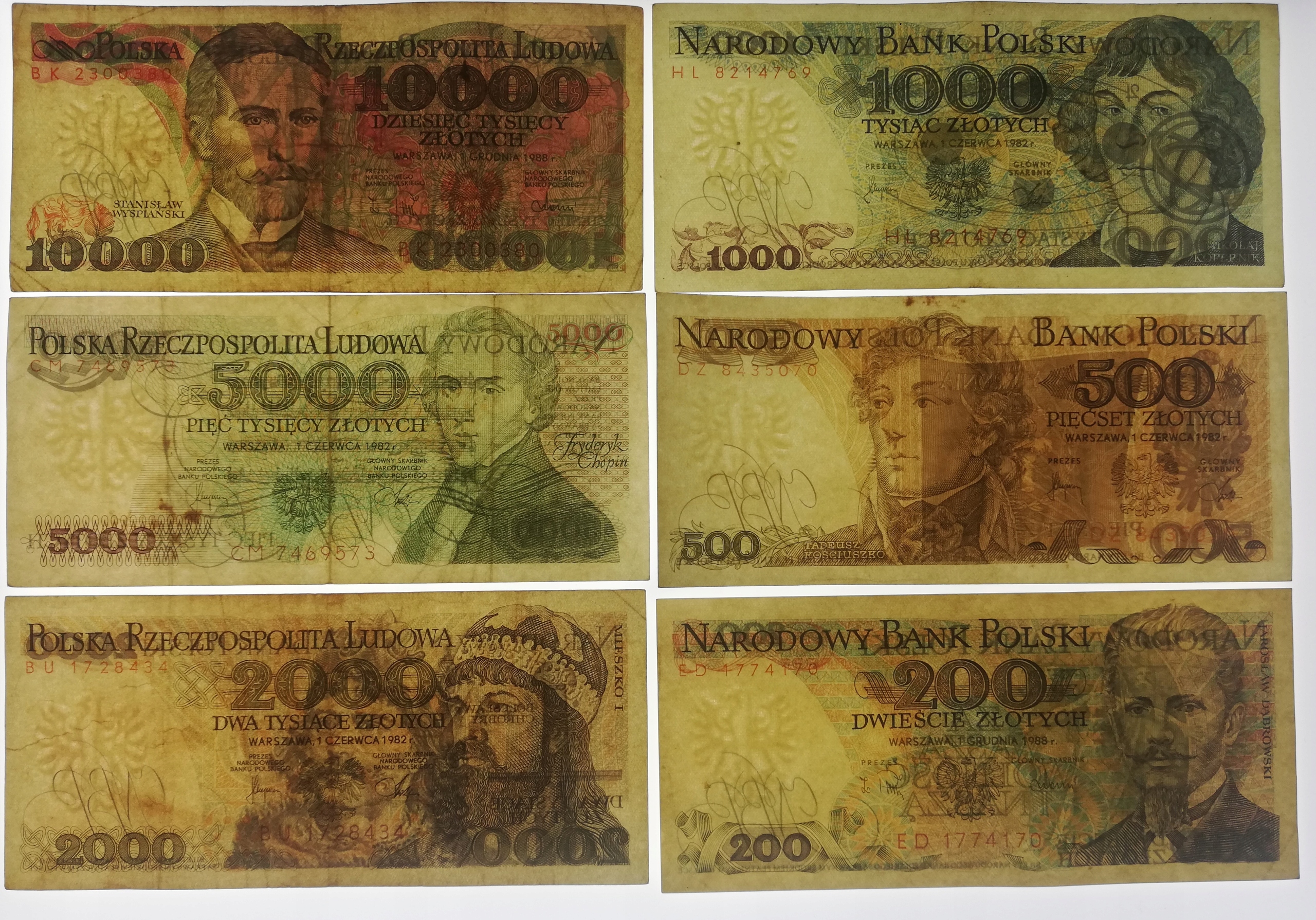 10 PLN 1982 г., PLN 20 1982 , 50 злотых 1988, 100 злотых 1986, 200 злотых 1988, 500 злотых 1982, 1 000 злотых 1982, 2 000 злотых 1982, 5 000 злотых 1982, 10 000 злотых 1988 >