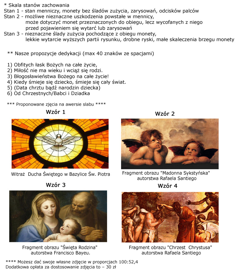 На реверсе пластины, кроме подробной спецификации: название монеты , состояние сохранности, индивидуальный номер монеты, имеется надпись: СУВЕНАРИЙ СВЯТОГО КРЕЩЕНИЯ ис местом для ВАШЕГО ПОСВЯЩЕНИЯ. На аверсе будет одно из выбранных вами изображений, символизирующее Святое Крещение. Благодаря этому это может стать очень интересной идеей подарка на Крещение.