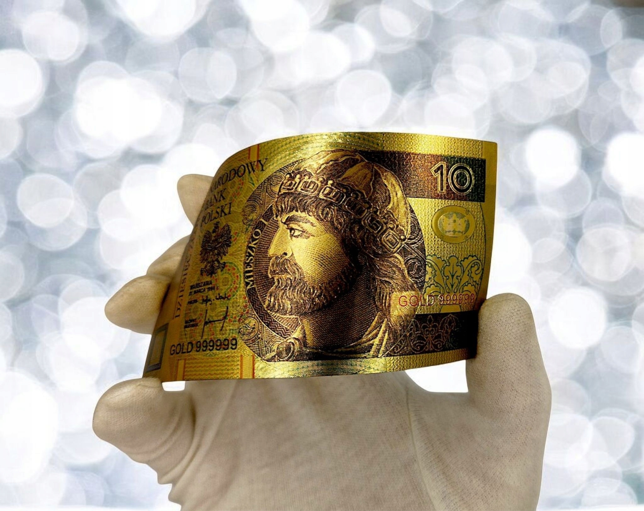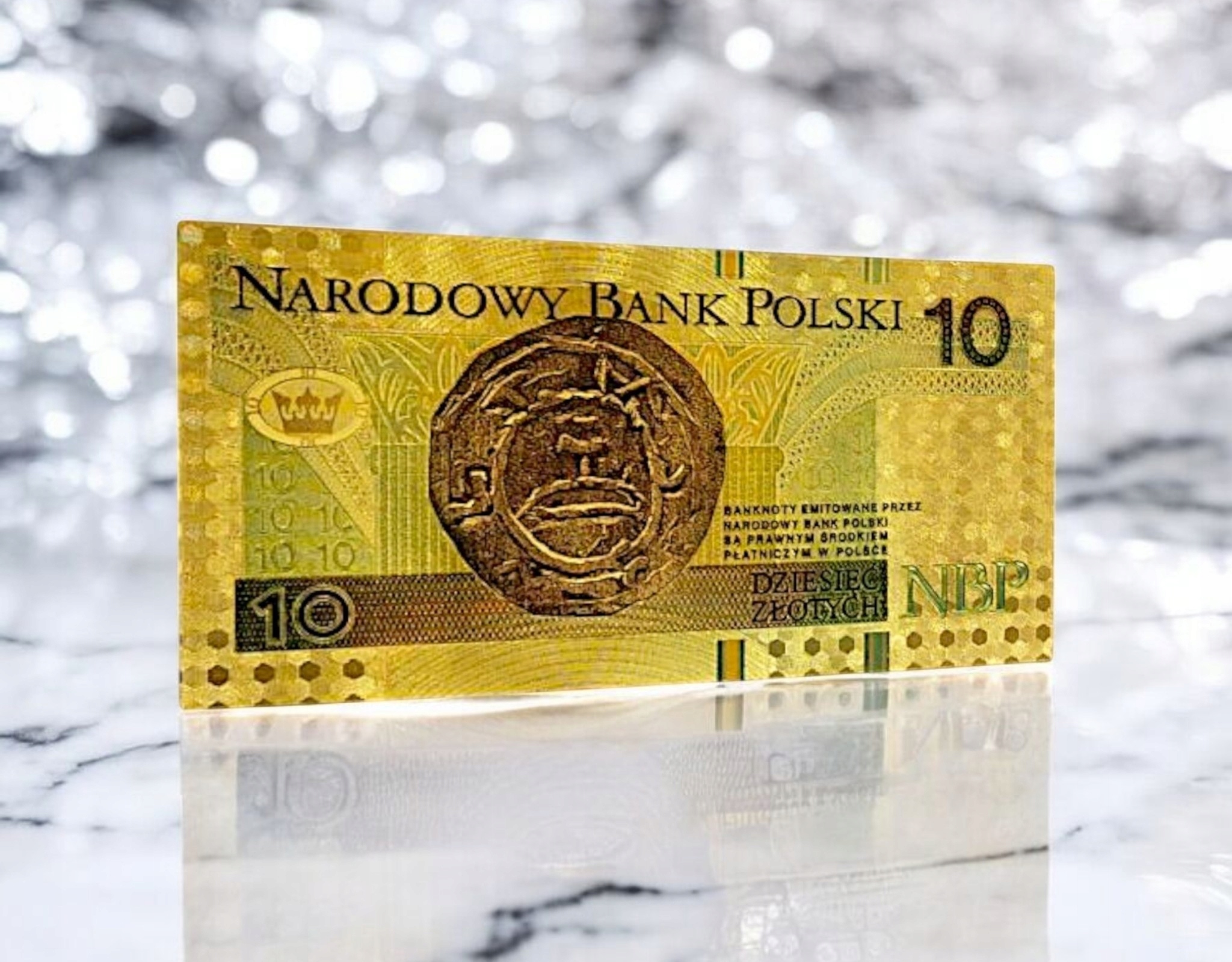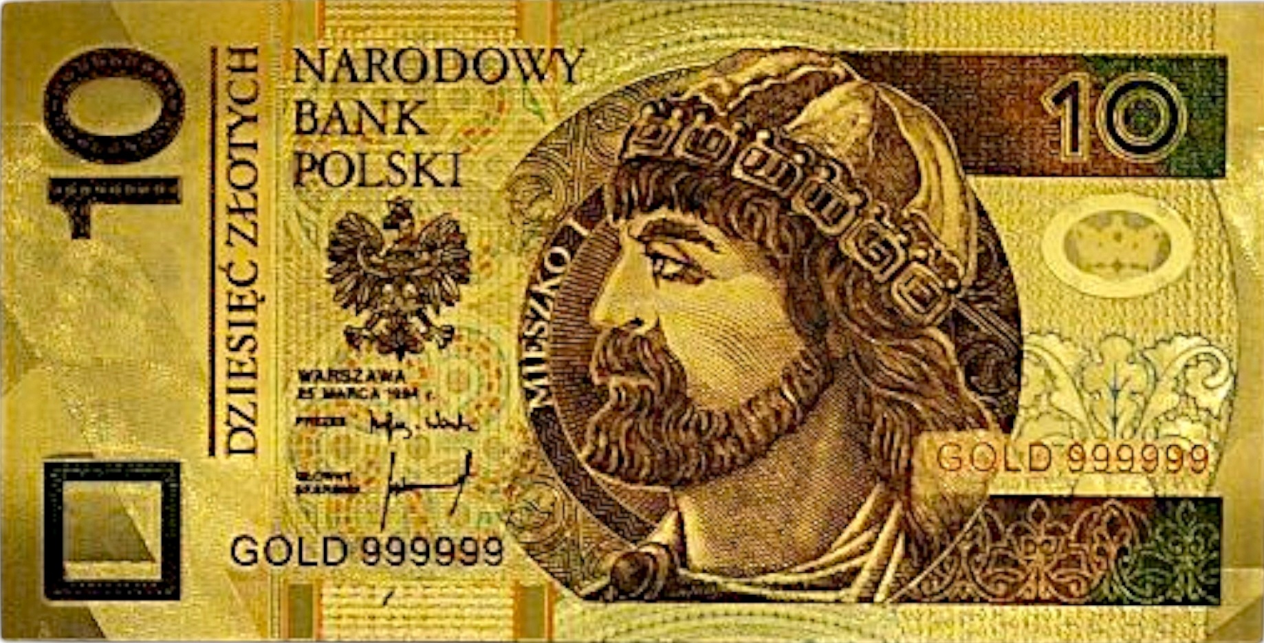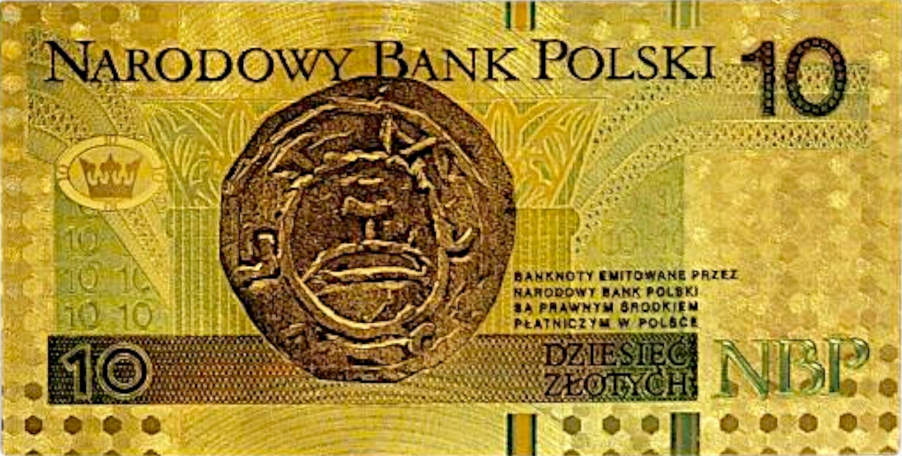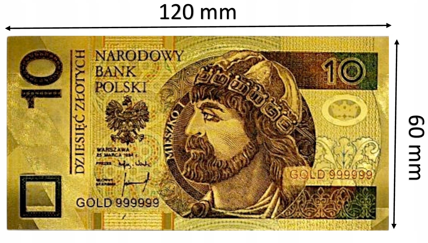 прекрасная копия банкноты польской циркуляции с этой деноминацией из ПВХ и покрытой золотой пленкой.