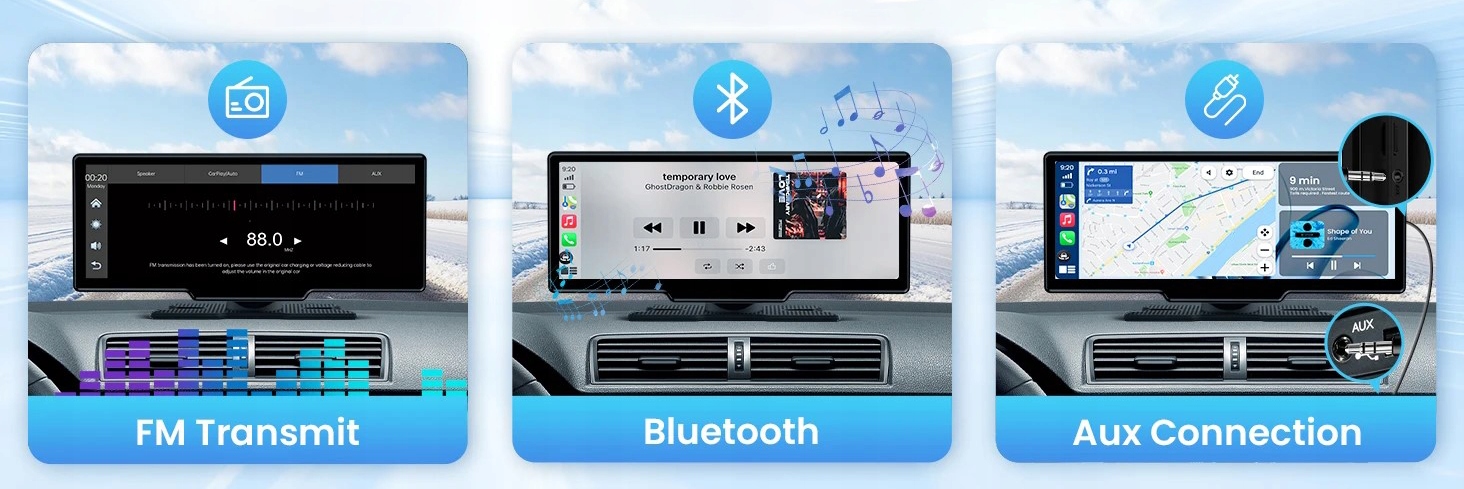 Высококачественный и стабильный звуковой выход (Вы также можете использовать подключение к FM/FUX для использования автомобильных динамиков.) Кроме того, экран CarPlay построил динамики высокого качества