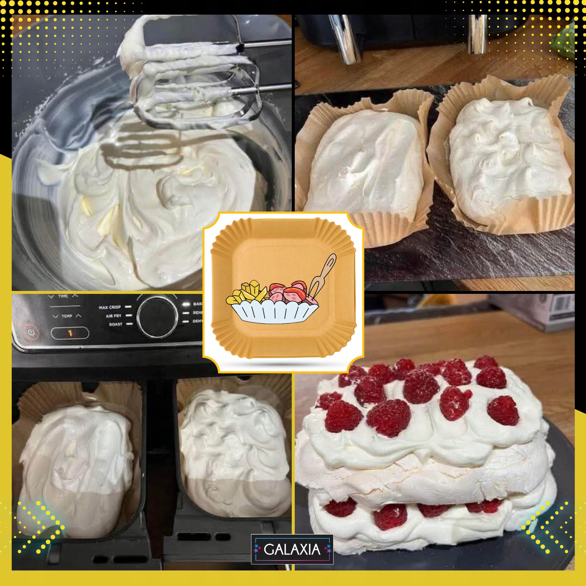 - ✔ 100 листов бумаги для воздушного фритюрного Galaxia® 20x20 см - ваш новый защитный щит против жира, сжигания и очистки. Вы ставите, выпекаете, выбрасываете - ноль мытье, максимальный комфорт. Готов к любой кулинарной миссии!