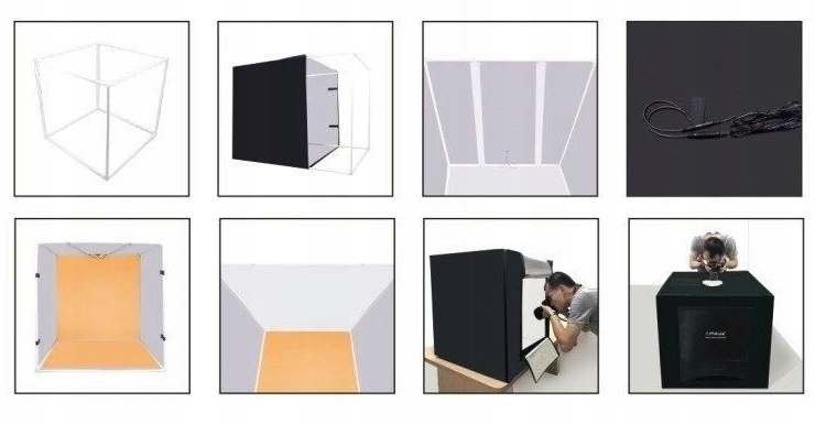 Широкий фронт позволяет фотографировать более крупные объекты, съемная передняя стенка позволяет избежать нежелательных отражений на поверхности, а отверстие в верхней части палатки позволяет фотографировать даже гладкие, зеркальные поверхности.