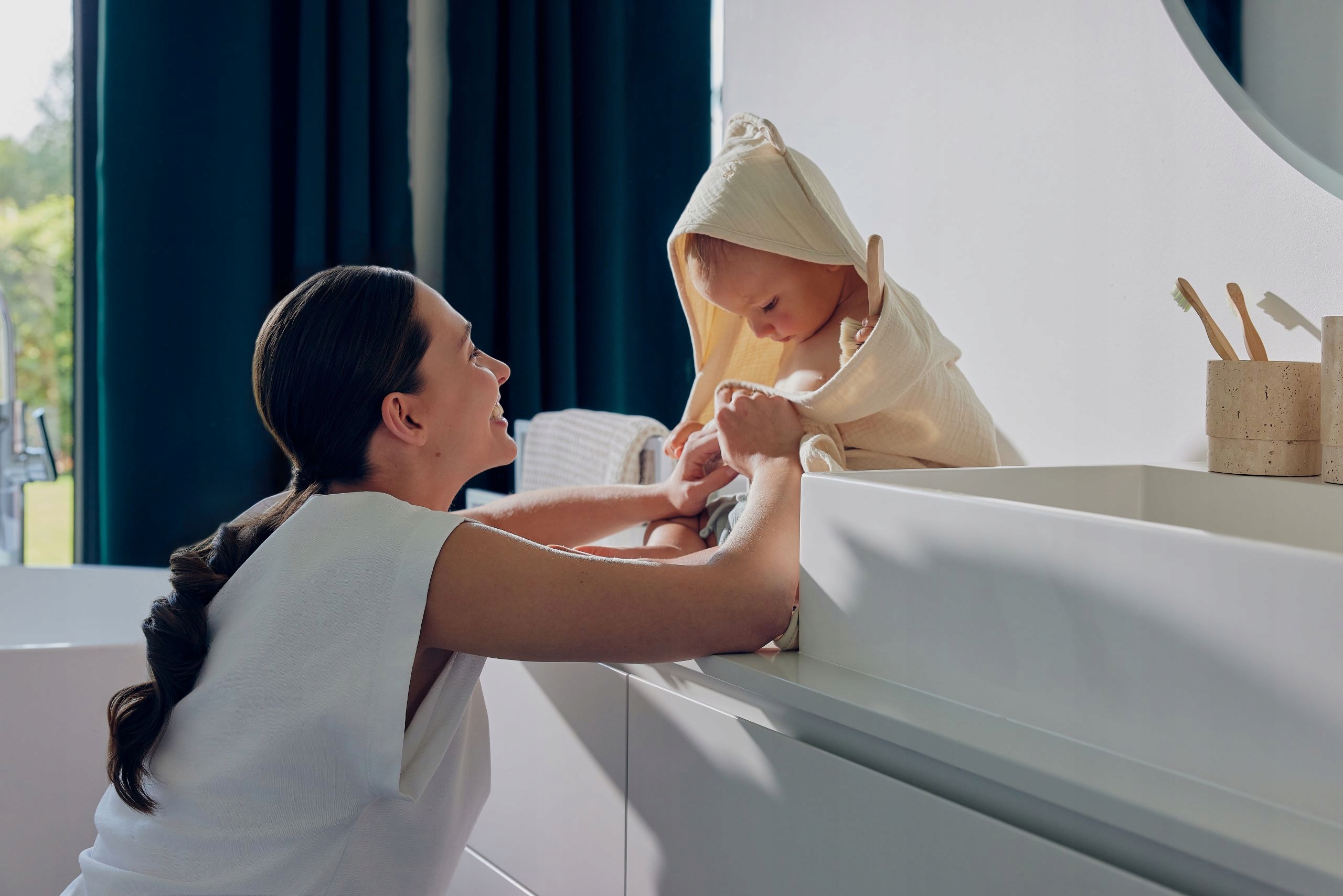 завершает голову ребенка, защищает от вызова и холода после купания. выглядит очаровательно и помогает построить ребенка с приятными ассоциациями с ритуалами купания.