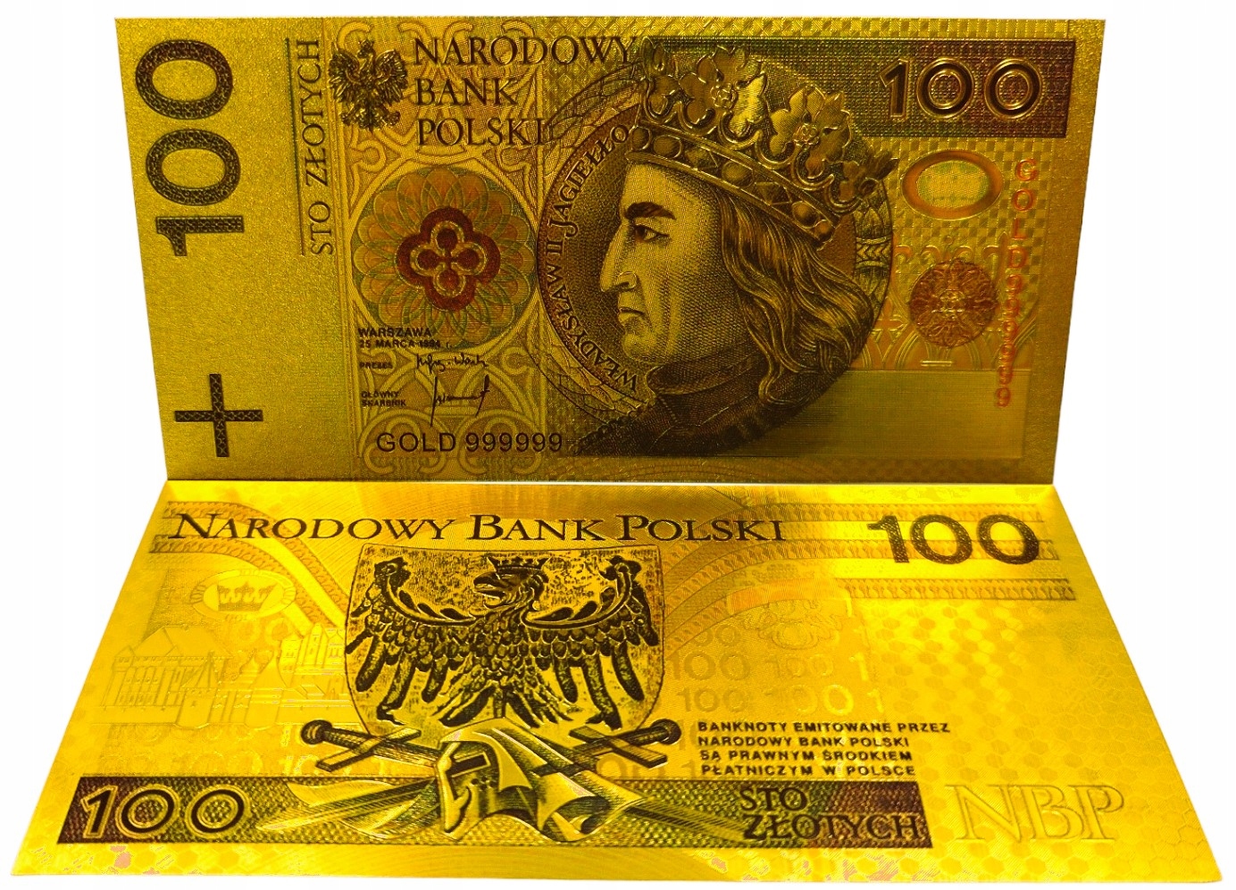 Точная копия польской банкноты того же номинала, изготовленная из ПВХ и покрытая золотой фольгой.