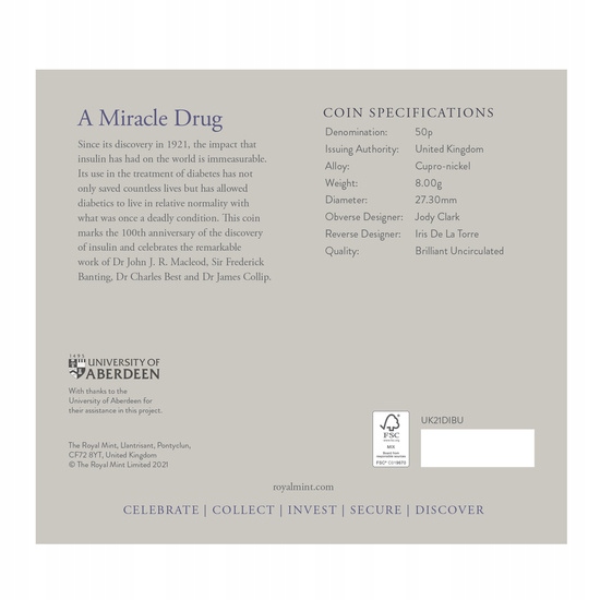 Монета 100-летия открытия инсулина 8 грамм медно-никелевого сплава 2021 года — монета, посвященная 100-летию выделения инсулина. Это великое открытие было сделано сэром Фредериком Бантингом в 1921 году. Два года спустя он стал лауреатом премии Нобра, будучи 32-летним мужчиной.