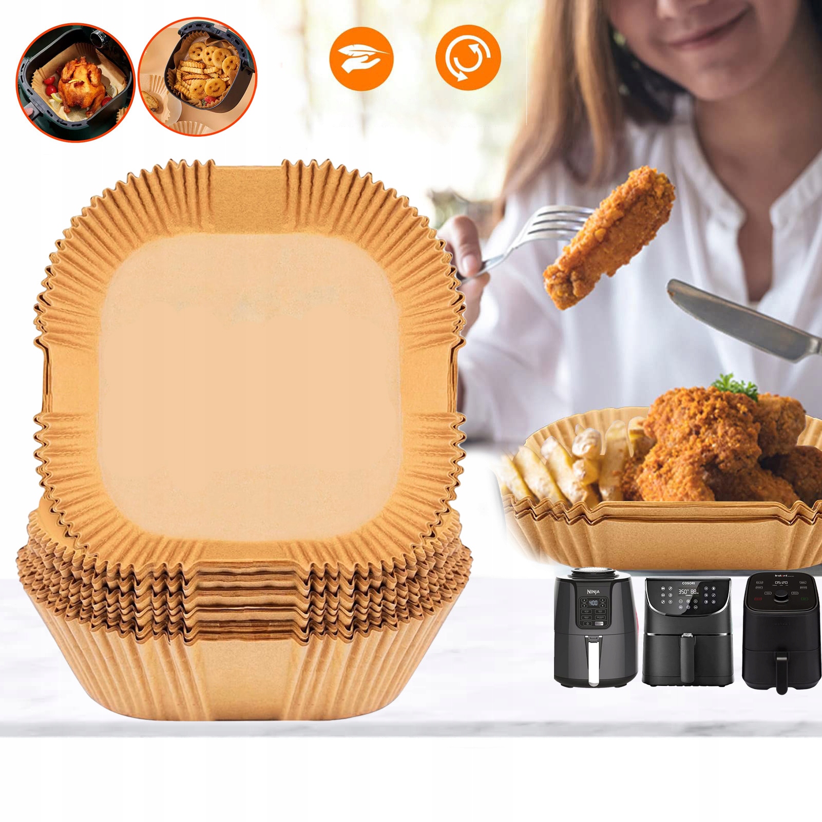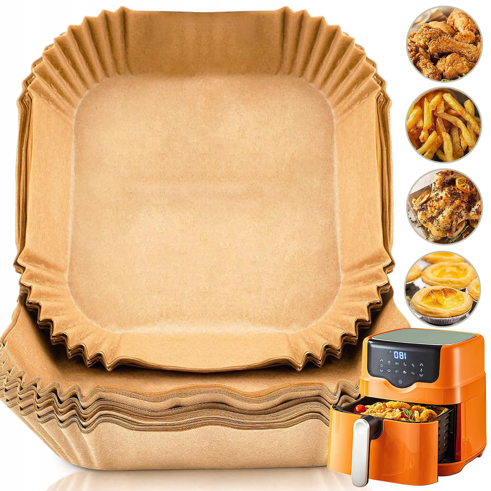 🥘【Идеальный размер】100 кусочков высококачественной, безопасной для пищевых продуктов бумаги для выпечки для фритюрницы размером 24 х 24 см и высотой края 4,5 см эффективно защищают фритюрницу от жира и остатков пищи. Наслаждайтесь выпечкой без беспорядка после использования нашей бумаги для аэрофритюрницы.
