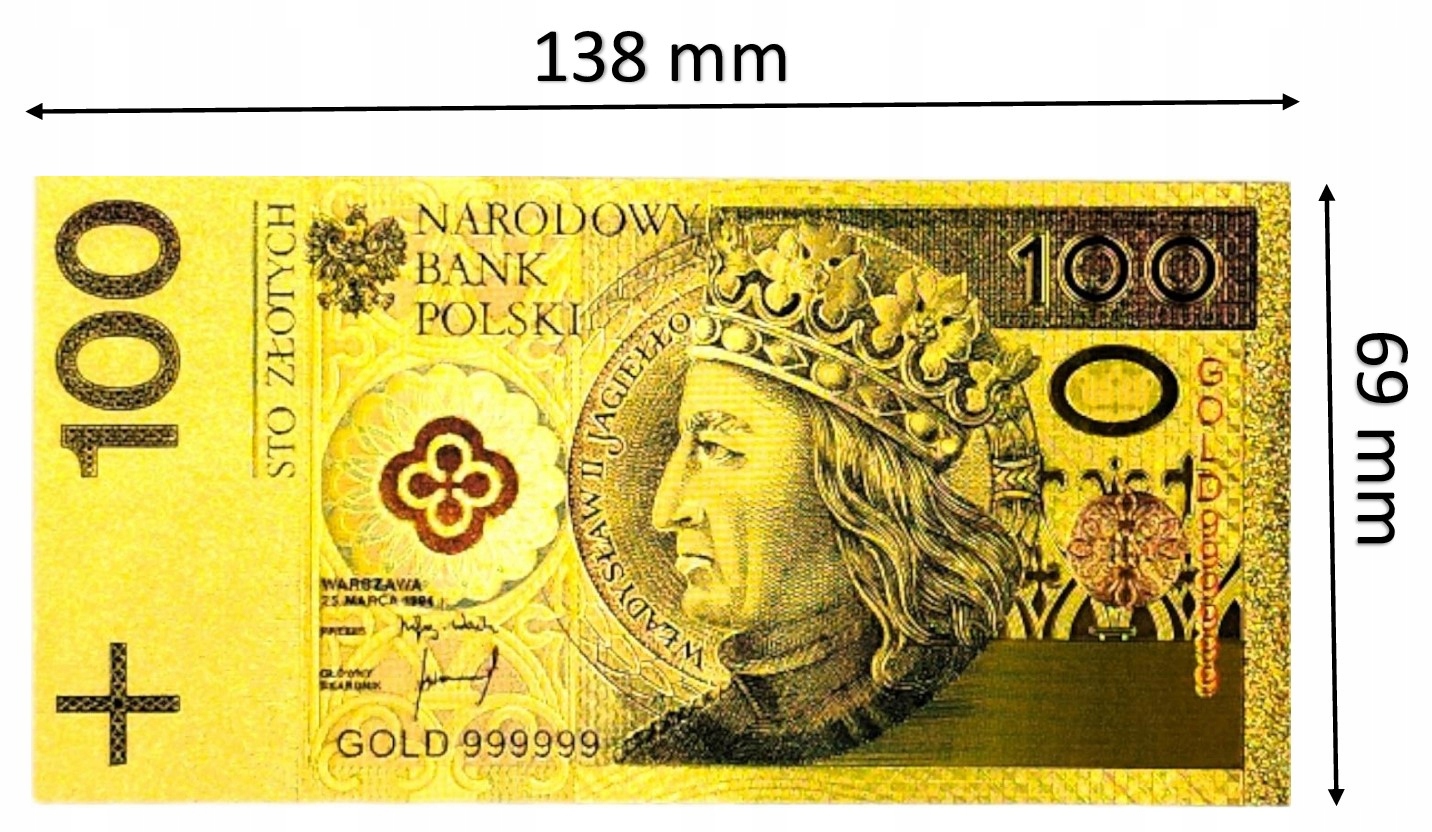 Красивая копия банкноты польского обращения номиналом 100 злотых, изготовленная из ПВХ и покрытая золотой фольгой.