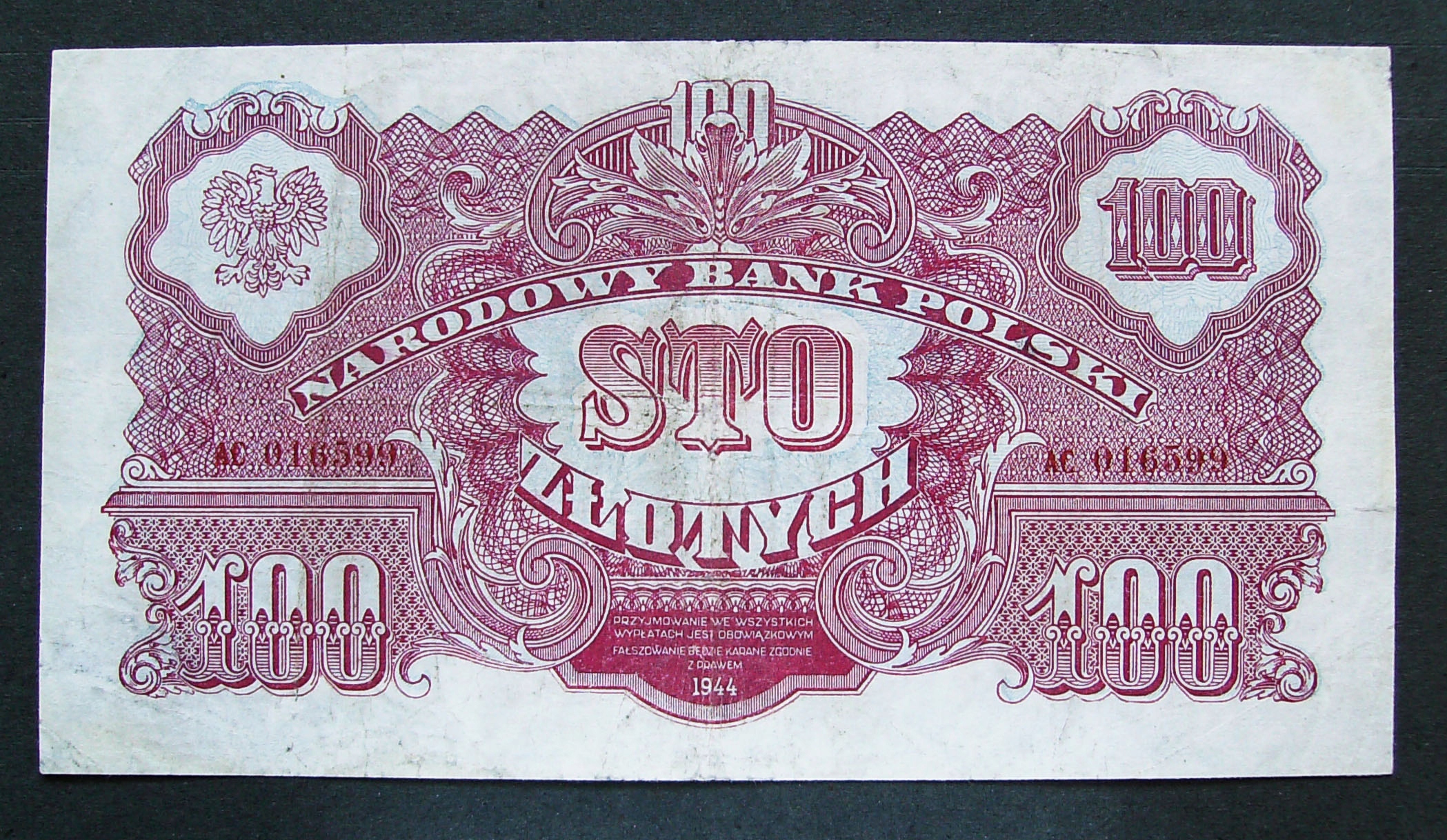 100 złotych 1944 seria - seria AC 016599 ( owym)