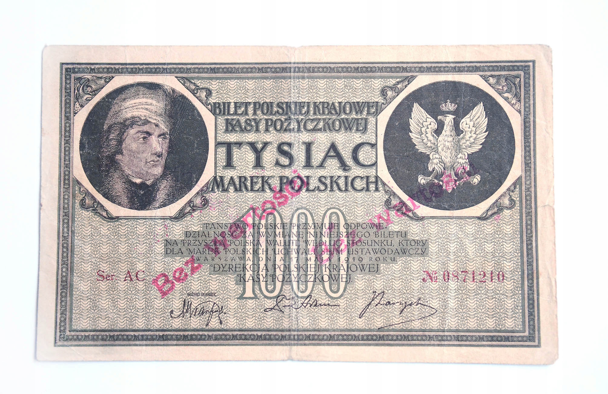 1000 Marek Polskich 1919 stempel "Bez Wartości" seria AC