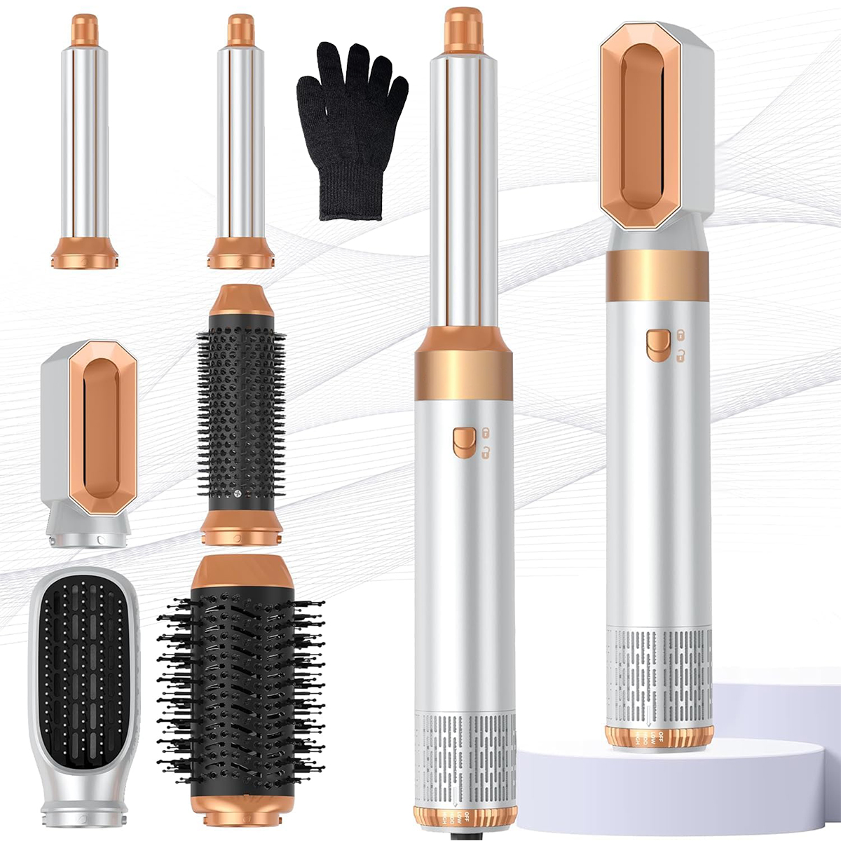 Этот набор для укладки волос 6 в 1 включает в себя 1 фен, 1 щетку с горячим воздухом, 2 щипцы для завивки, 1 фен с круглыми наконечниками. щетка и 1 щетка для массажа горячим воздухом. Щипцы для завивки 6-в-1 автоматически завивают волосы, устраняют пушистость и разглаживают пряди, обеспечивая безупречный блеск сухих, прямых или выпрямленных волос.