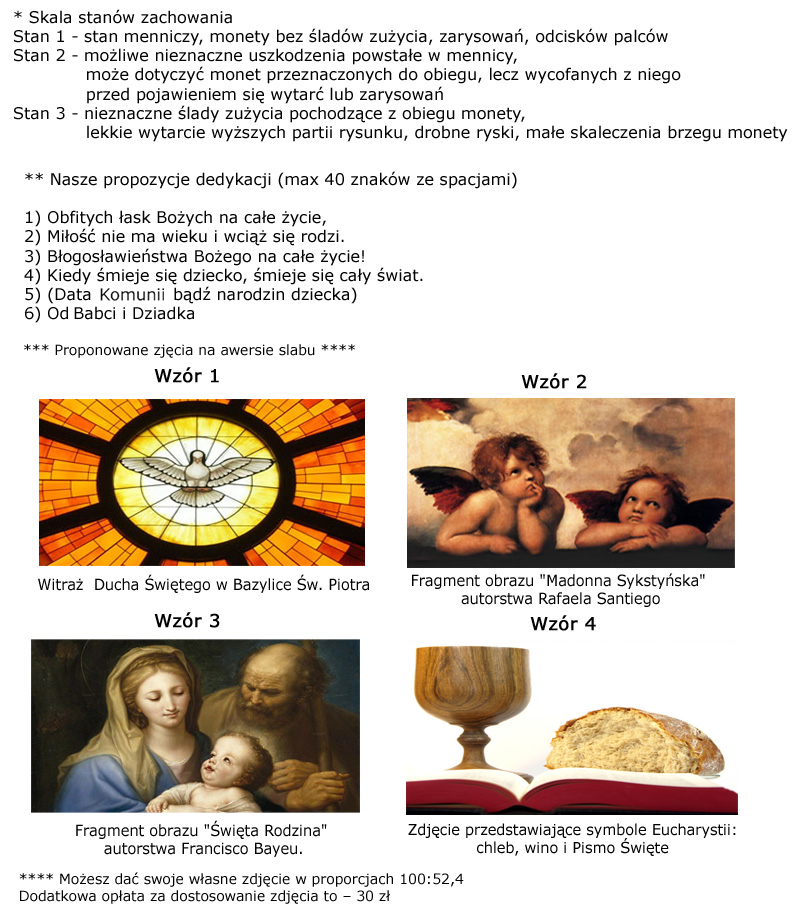 На реверсе пластины, кроме подробной спецификации: название монеты. монета, ее состояние, индивидуальный номер монеты, имеется надпись: СУВЕНАРЬ И СВЯТОЕ ПРИЧАСТИЕ с местом ДЛЯ ВАШЕГО ПОСВЯЩЕНИЯ. На аверсе будет изображено одно из выбранных вами изображений, символизирующих таинство. Благодаря этому это может стать очень интересной идеей подарка к Первому Причастию.