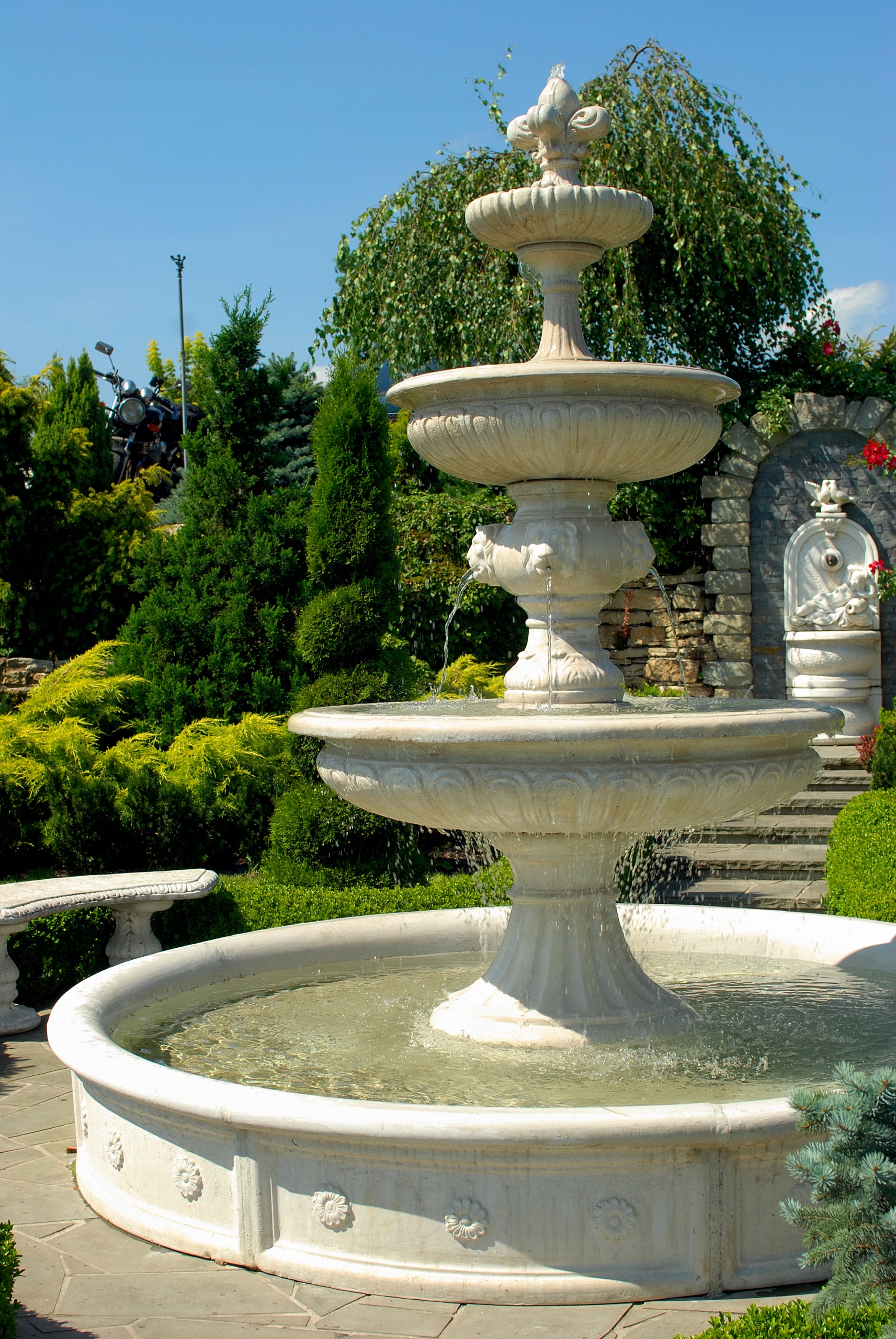 Фонтан состоит из трех чаш, кроме того, на двух уровнях имеются отверстия, через которые вода выбегает, а затем стекает вниз последовательными каскадами. Внешний вид фонтана потрясающий, а тщательно проработанные элементы, например, львиные головы или украшения чаши, прекрасно смотрятся в любое время дня и ночи. Большой садовый фонтан выделяется среди других моделей прежде всего тем, что позволяет выбрать цвет и стиль, наиболее подходящий к общему декору окружающей обстановки. Решив приобрести данный фонтан, стоит подумать об установке освещения, благодаря которому мы сможем лучше подчеркнуть его форму после наступления сумерек.