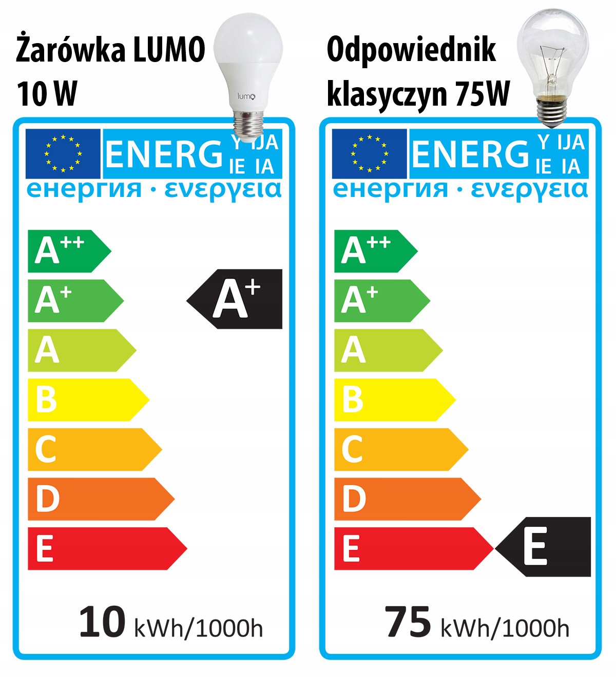 Лампа LUMO мощностью 10 Вт излучает свет, сравнимый со светом традиционной лампы с потребляемой мощностью 75 Вт.