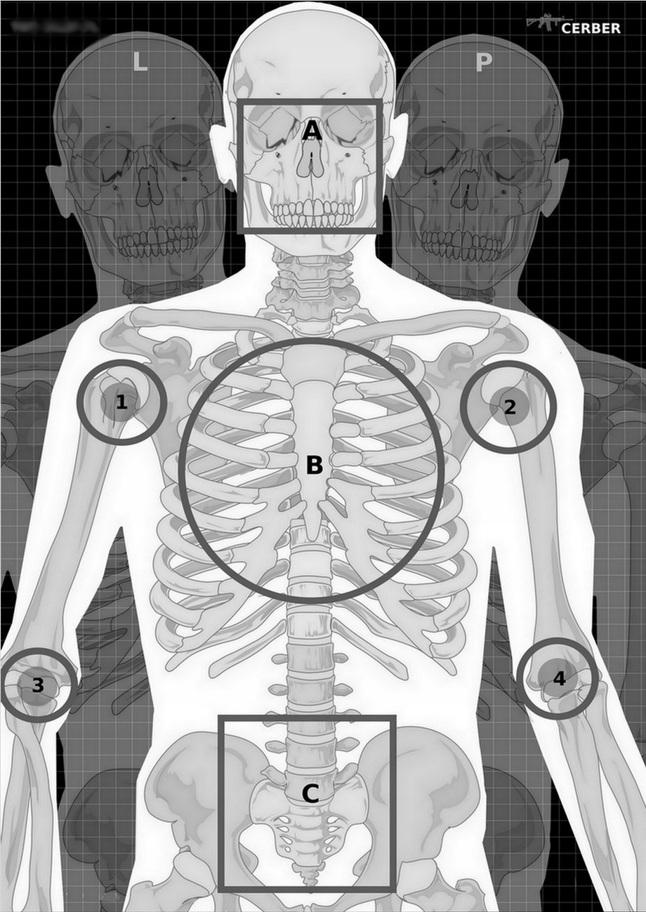 На мишени изображен силуэт человека, составляющий основную мишень, разделенный на целевые зоны.