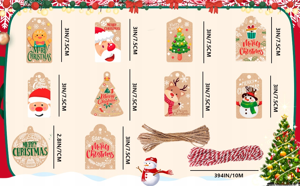 • Уникальные рождественские бумажные бирки: эти рождественские подарочные бирки на веревке имеют 10 различных стилей дизайна, охватывающих множество рождественских узоров, таких как рождественская елка, Санта-Клаус, снеговик и т. д., что может гарантировать, что каждая из ваших рождественских подарочных бирок дополнит вашу рождественскую атмосферу.