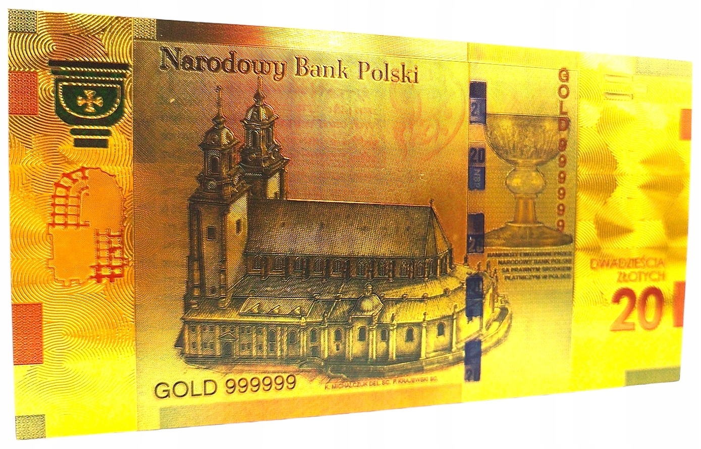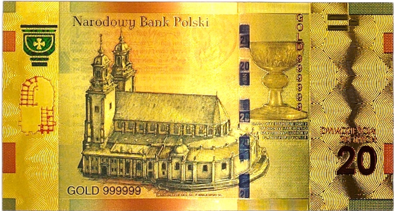 Реплика польской коллекционной банкноты из ПВХ и покрыт золотой фольгой.