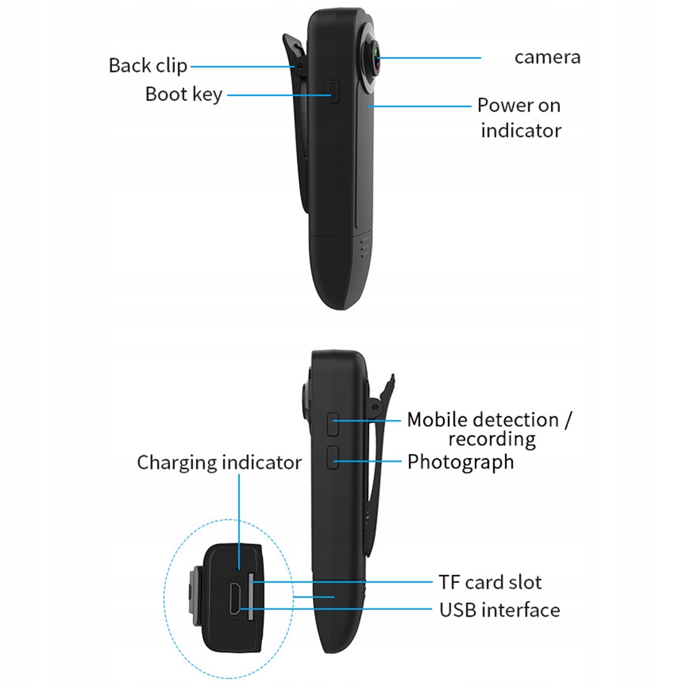 2. Конструкция задних зажима, вы можете обрезать носимую камеру корпуса к карманам, мешкам, папкам и т. Д., Легко настроить для записи в любое время.