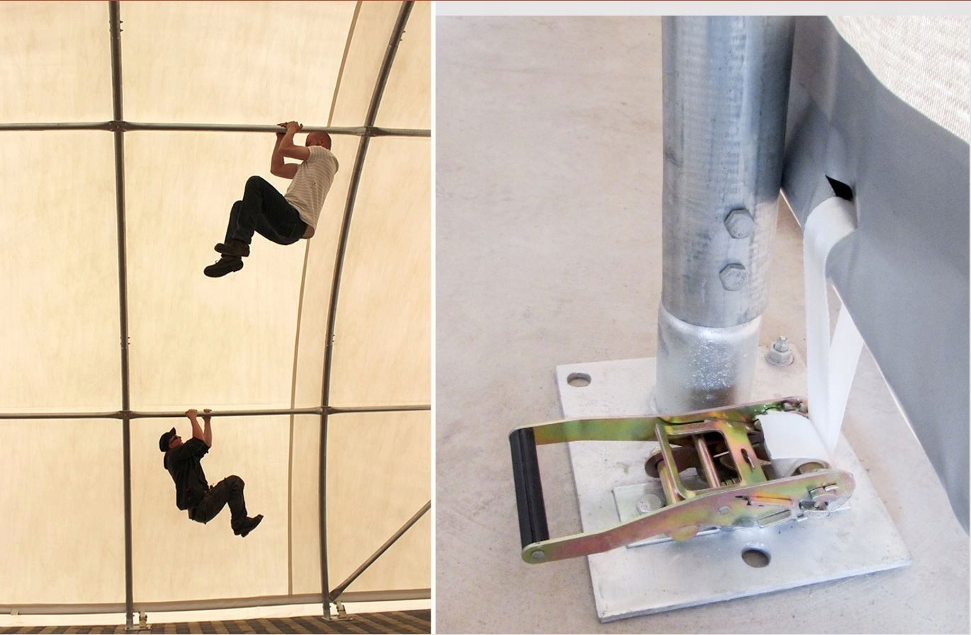 зал привязан непосредственно к земле со стальными якорями, которые соответствуют твердой или мягкой земле. Поэтому прикрепление зала к земле очень постоянно.
