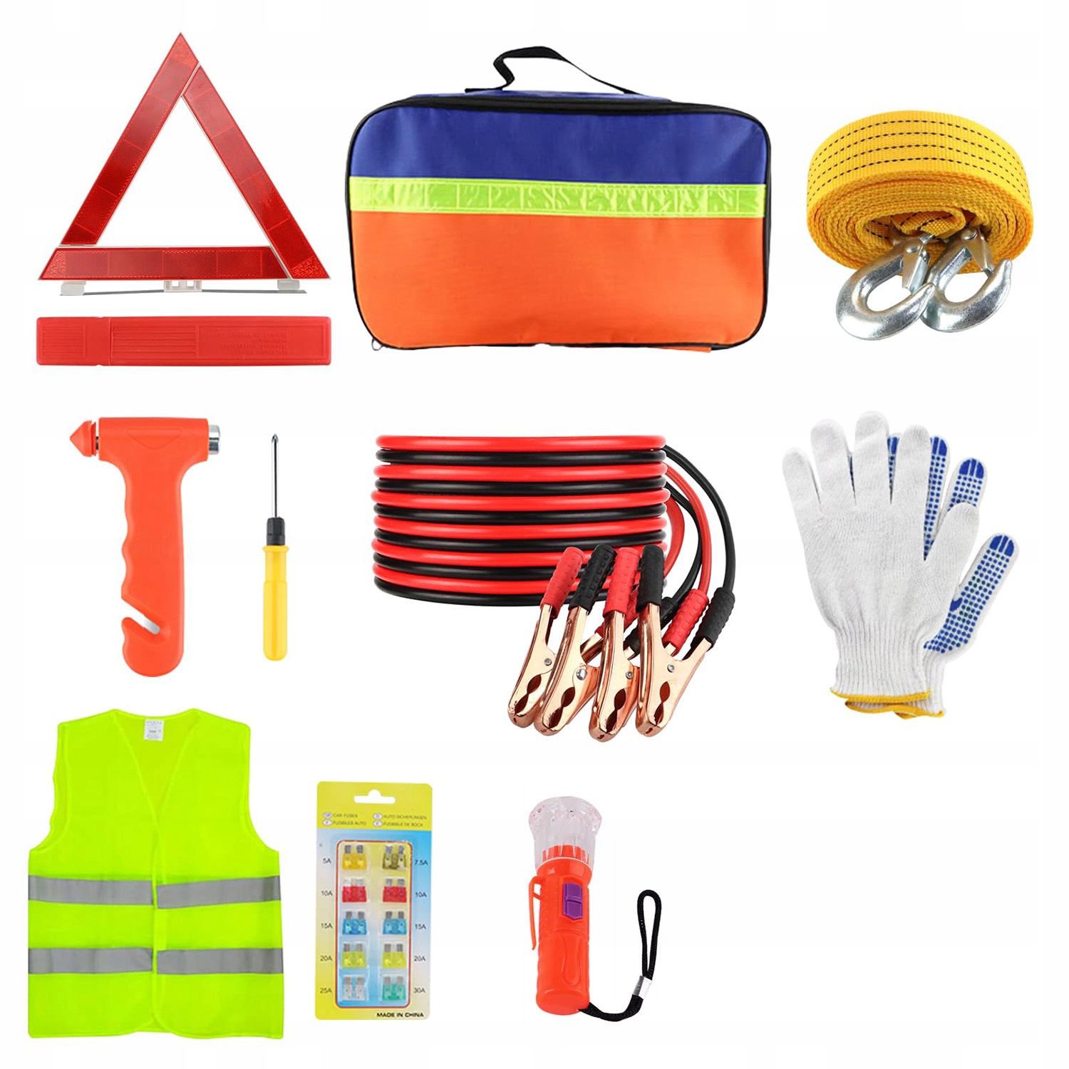 - много -функциональный аварийный инструмент - аварийный комплект автомобиля представляет собой набор из 10 в 1, который содержит стартовые кабели, буксирное веревку, предупреждающий треугольник, предохранитель, защитный молот, аварийный свет, отвертка и перчатки, отражающий жилет безопасности и мешок для хранения. Прикрепленная сумка для хранения позволяет легко хранить экстренные аксессуары, поэтому их нельзя легко потеряться. Он маленький и компактный, поэтому его можно хранить в любом месте ствола, на заднем сиденье или в хранении шин. Это идеальный и практичный подарок для семьи и друзей.