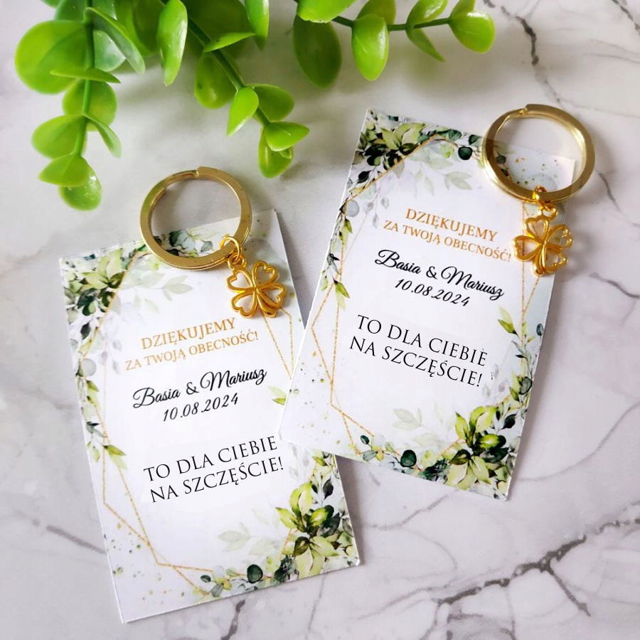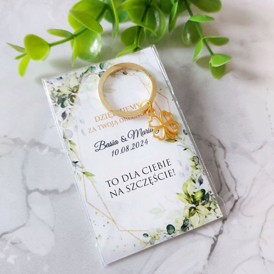 Благодарственное письмо для гостей состоит из именной открытки и любого брелока, например, клевера, слона или крестика.