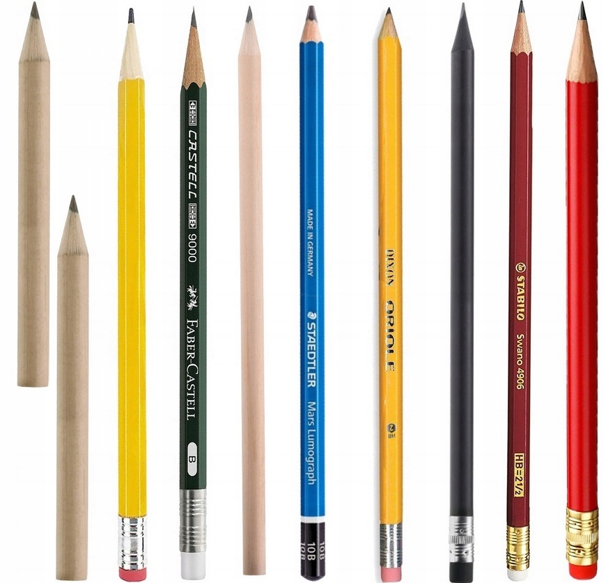 Карандаши в наборе цельные, деревянные, с ластиками или без. Карандаши бывают разных цветов, с различной графикой, логотипами, гравировкой или без рисунков. Они также доступны разной длины, большинство из них заточены.