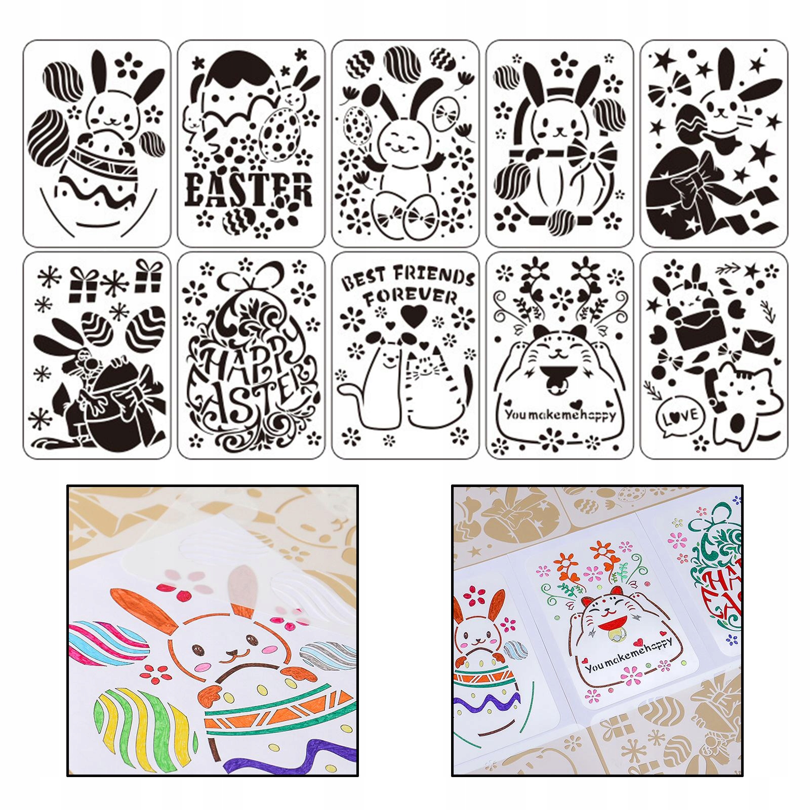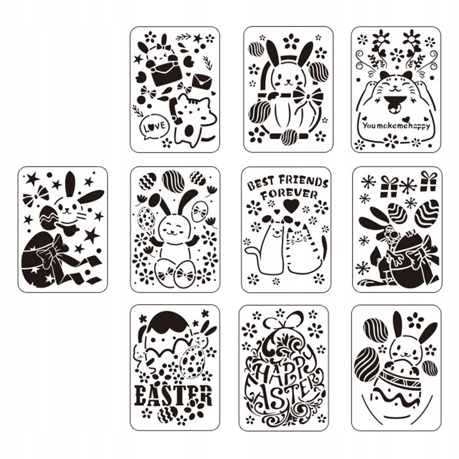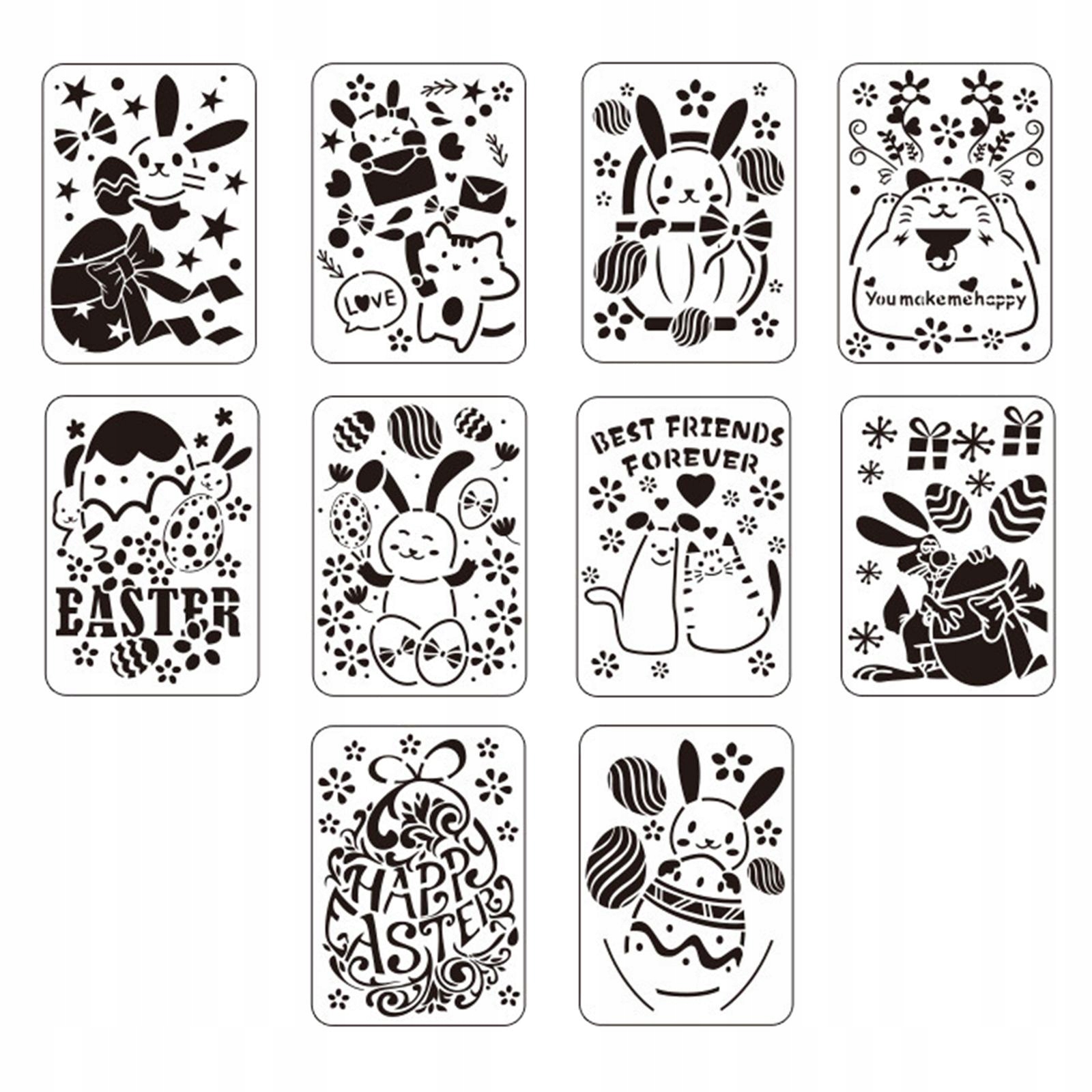 В комплект входят 10 пасхальных трафаретов в различных стилях, подходящих для украшения журналов, скрапбукинга, настенных трафаретов, украшения ткани, украшения торта, аэрографии, изготовления открыток для фотоальбомов и многого другого.
