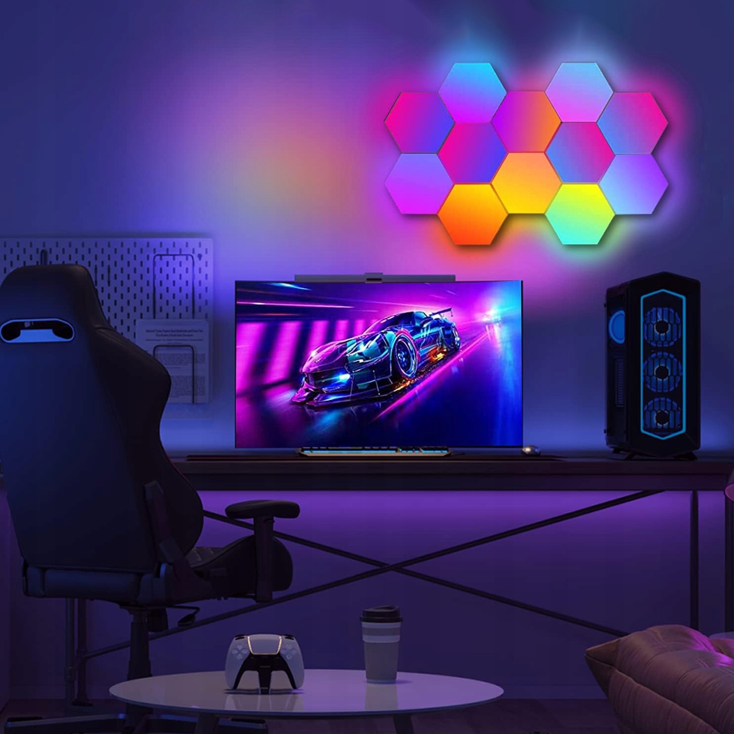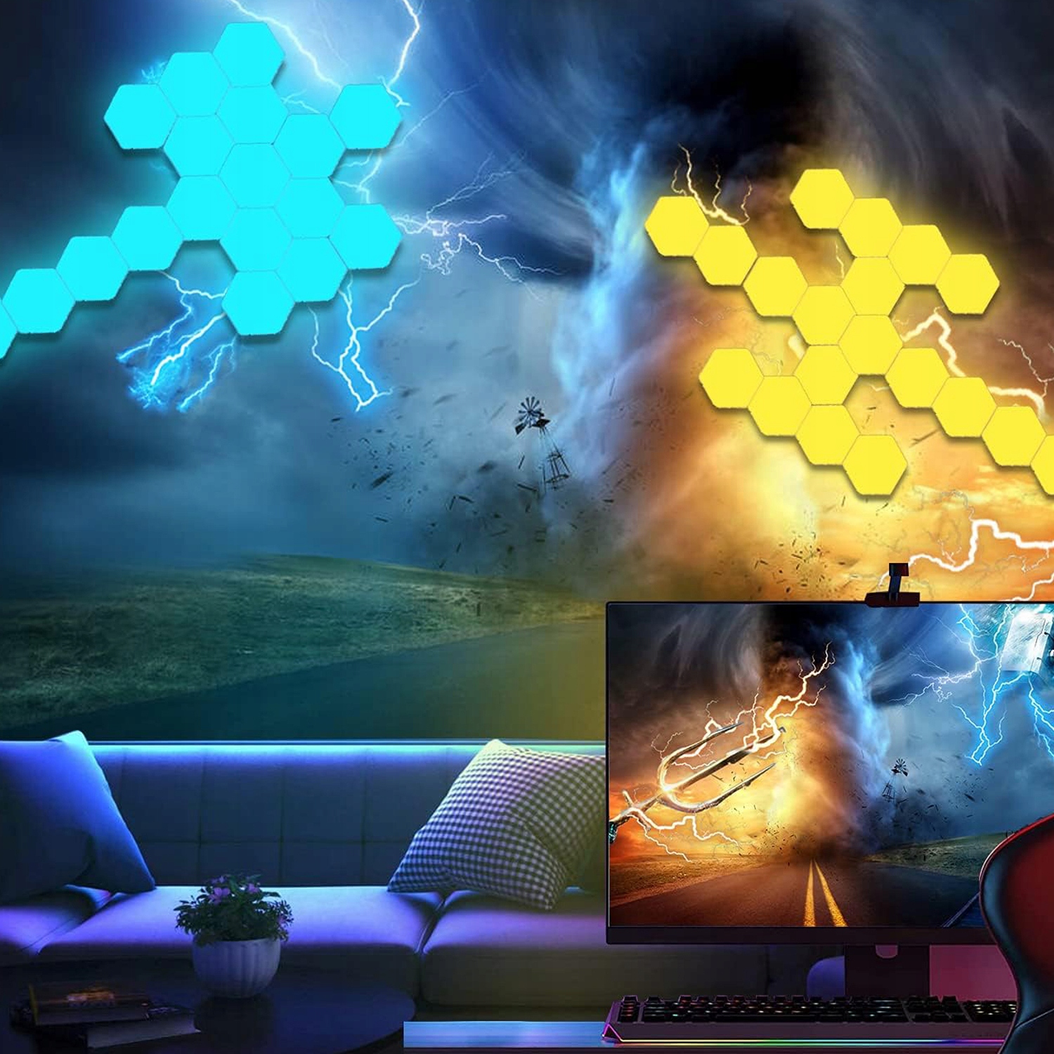Светодиодные световые панели легко синхронизируются со звуками игр или телевизора. Улучшите свои впечатления от игр, просмотра фильмов и прослушивания музыки благодаря яркому освещению, 16 миллионам цветов и динамическим режимам. В отличие от других статических игровых светильников, наши шестиугольные светодиодные фонари создают более захватывающие ощущения во время игр, просмотра фильмов или матчей! Когда придет время держать обе руки на клавиатуре и мыши, используйте голосовые помощники Alexa или Google, чтобы управлять освещением без помощи рук