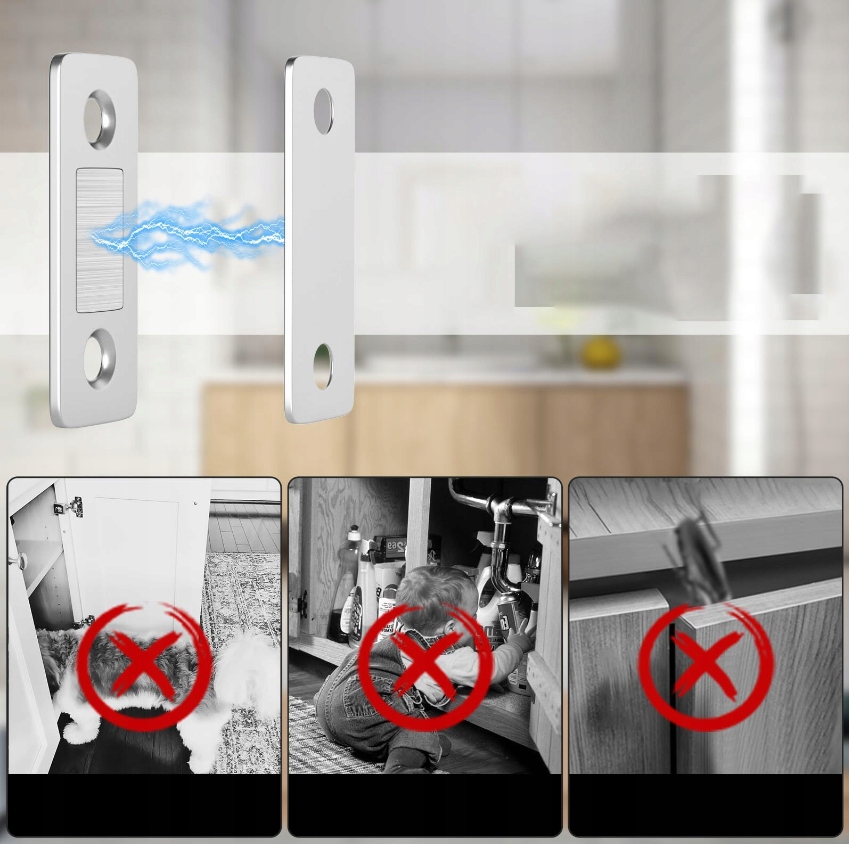 Мощная магнитная сила: Эта магнитная дверная защелка содержит один магнит, который удерживает постоянно открывающиеся дверцы кухонного шкафа или ящики закрытыми, что подходит для дверей, защелка или петля которых непригодна для использования