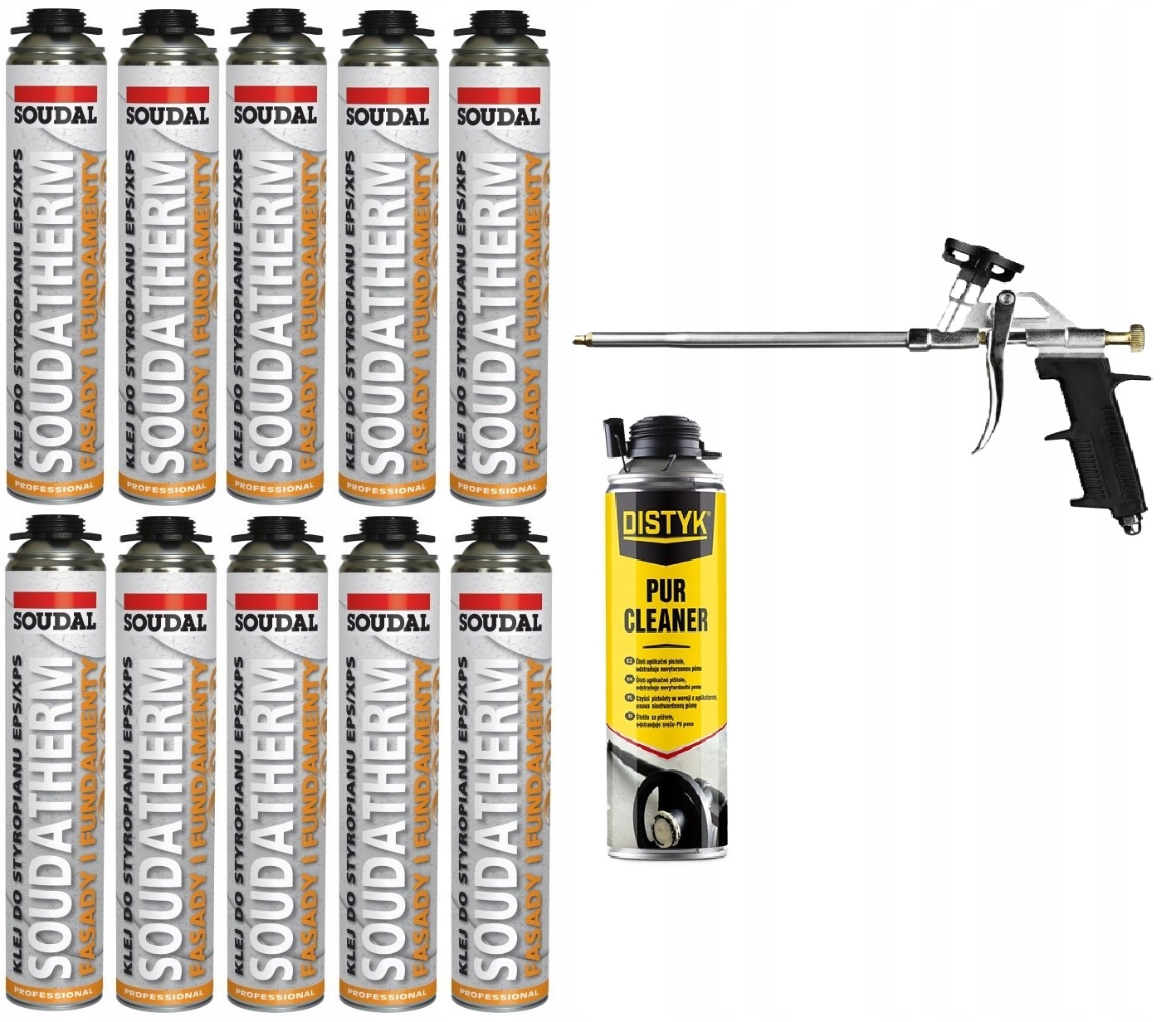 10 шт. SOUDAL ПЕНОСТРОИТЕЛЬНЫЙ КЛЕЙ XPS EPS SOUDATHERM + ОЧИСТИТЕЛЬ + ПИСТОЛЕТ