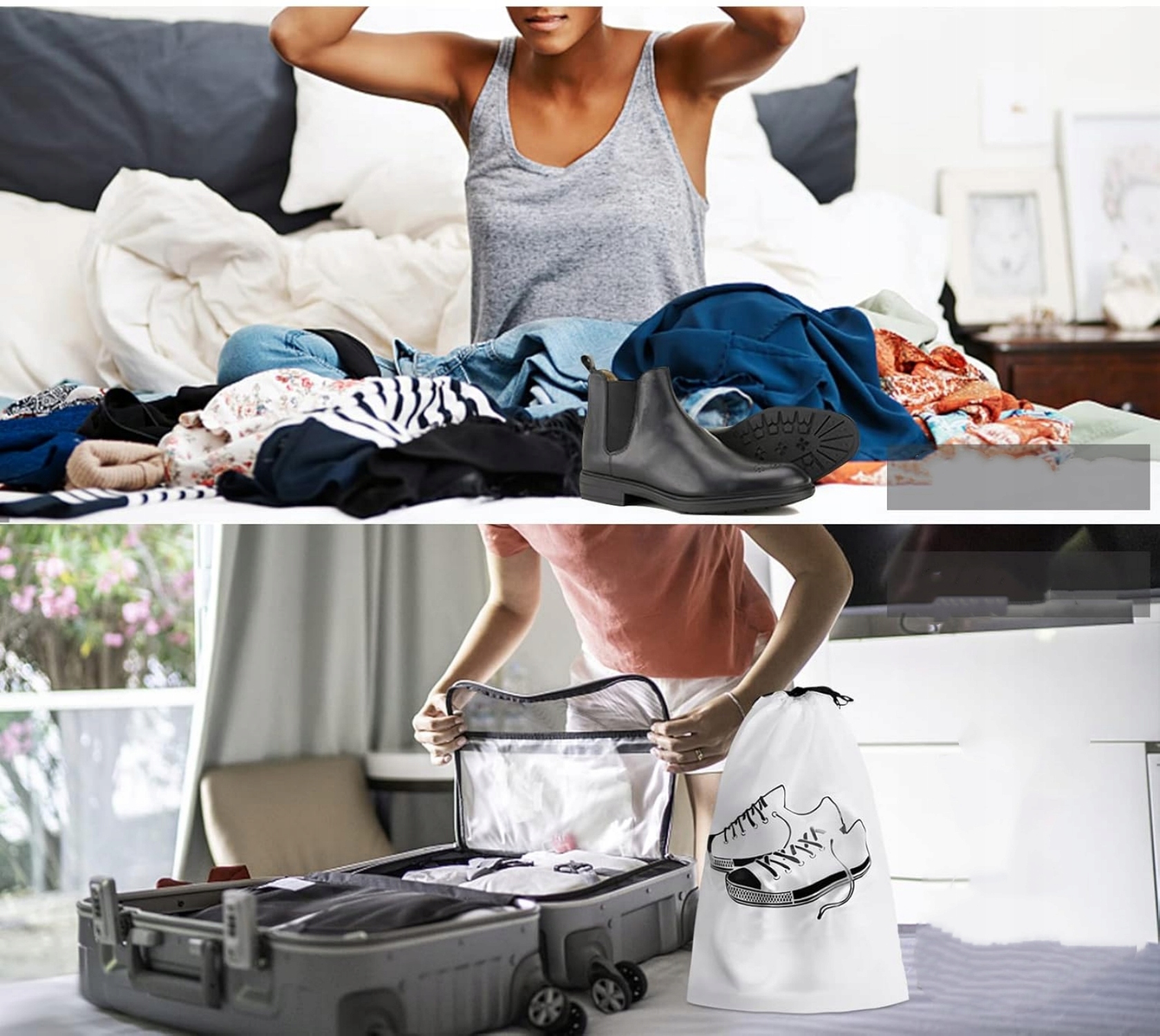Эти пылезащитные пакеты можно использовать не только для хранения обуви, носки, нижнее белье, влажные полотенца, косметику, туалетные принадлежности и т. д. Идеально подходят для упаковки вещей в дорогу и организации домашнего хозяйства, сохраняя ваш чемодан в чистоте и порядке.