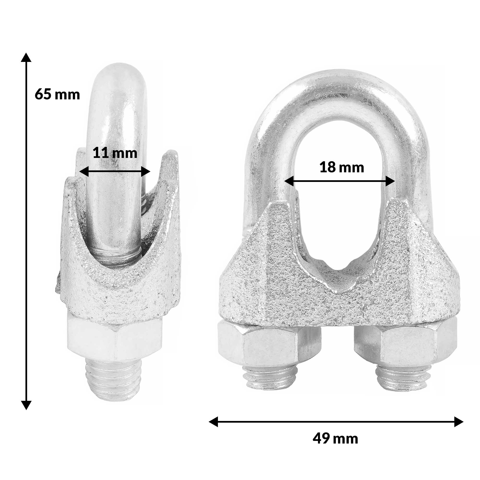 Верхние канатные зажимы предназначены для зажима и соединения стальных и искусственных канатов. Используется в строительстве, садоводстве и рекламной индустрии. Зажимы применяются для многопрядных канатов. Размер зажима определяет размер подходящей веревки. В сочетании с коушем (размер коуша определяет соответствующий размер веревки) на конце веревки можно сделать «проушину» для защиты веревки от истирания и деформации.