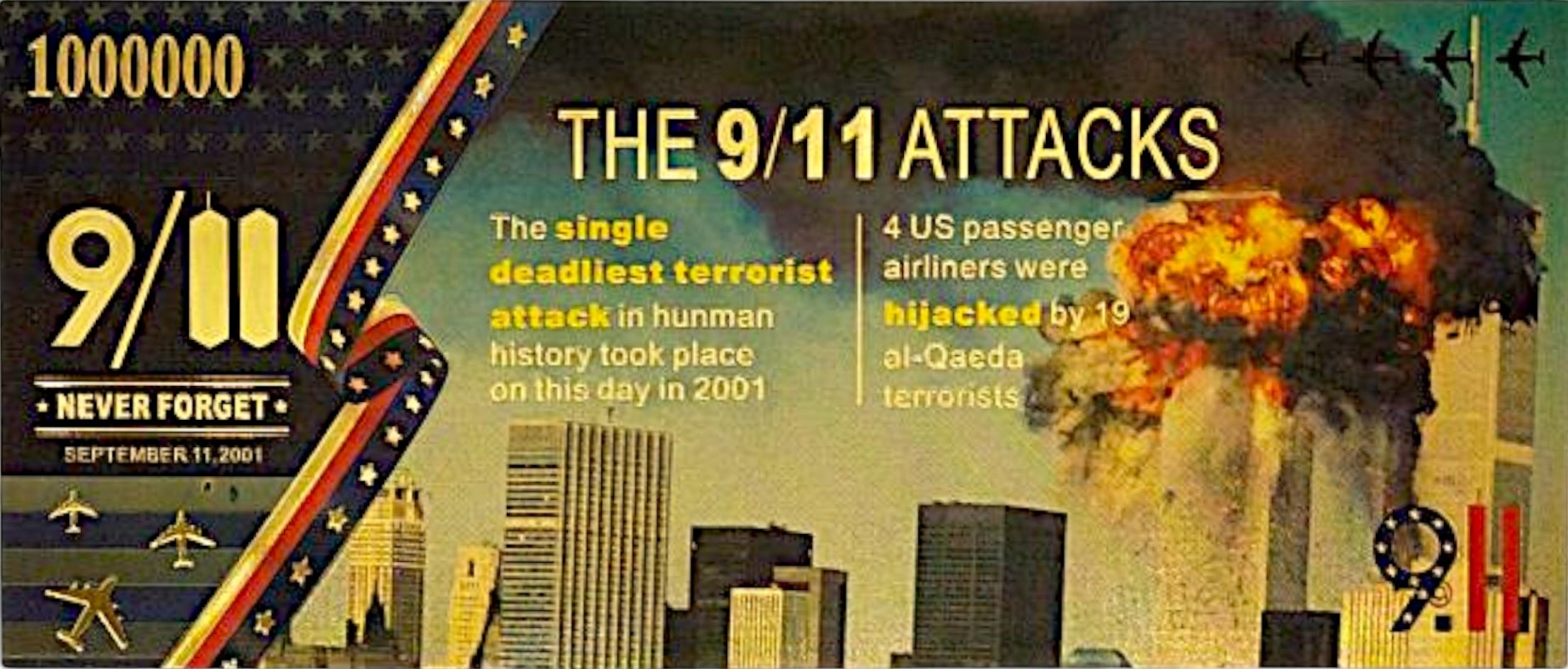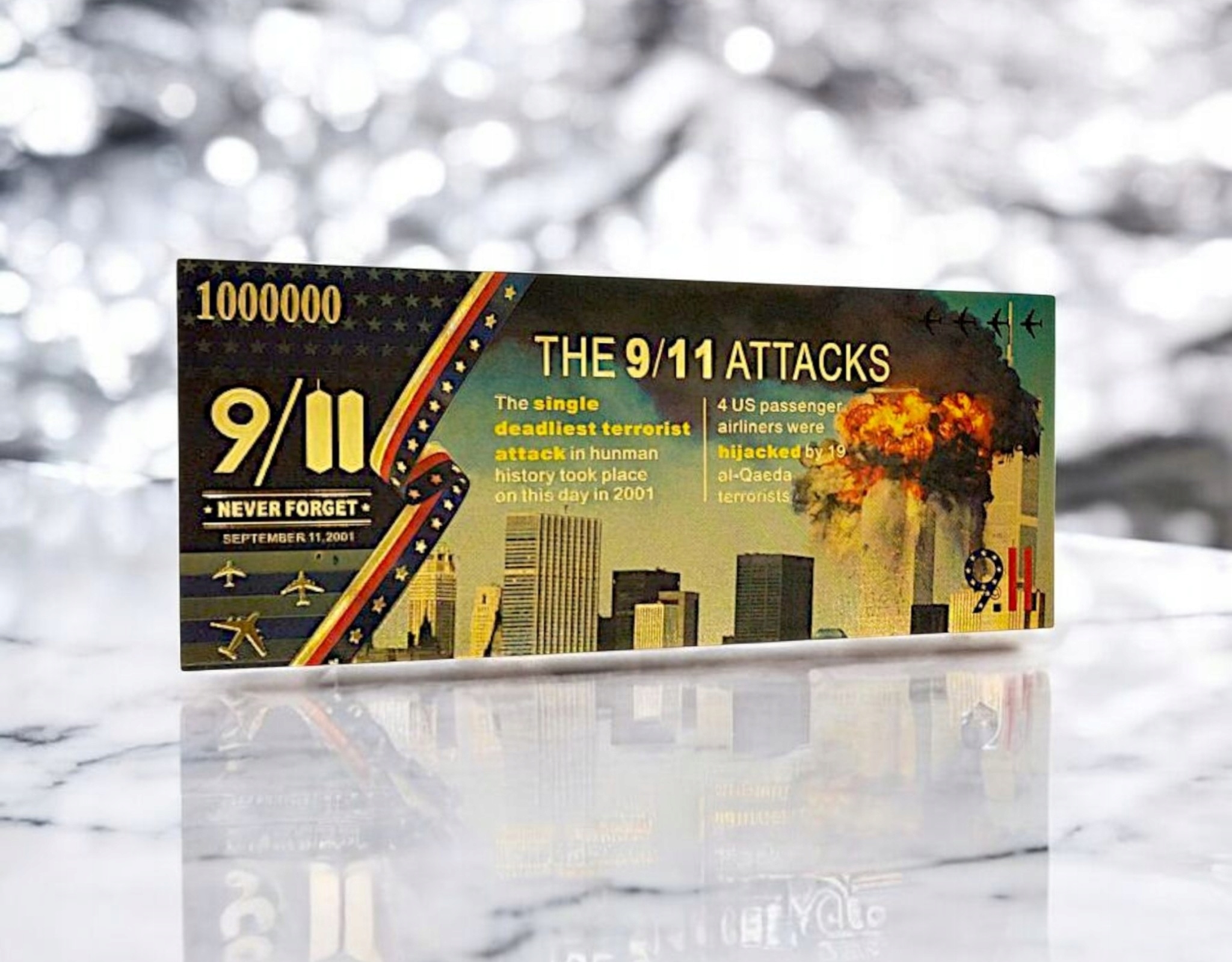 уникальная банкнота коллекционера, сделанная из прочного ПВХ -пластика, изображающая один из самых новаторских и драматических моментов в истории современного мира - террористические атаки 11 сентября 2001 года в Соединенных Штатах. H2>