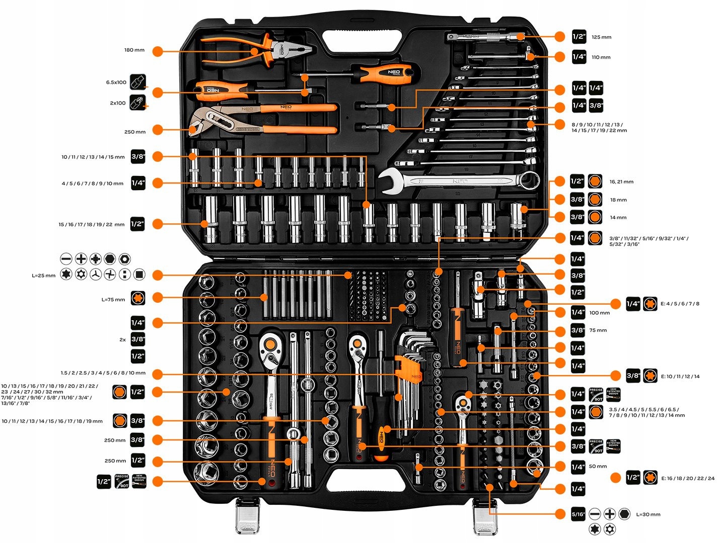 содержит до 233 элементов в размерах 1/2", 3/8 "и 1/4" высококачественной хромированной ванаде. Ключи доставляются в практическом и твердом пластиковом чемодане с металлическими защелками и удобной ручкой. E caps, тип E, кончики отвертки (в различных конфигурациях, в том числе удлиненные винты, помещенные в глубокие розетки), шестигранные ключи (поставляемые в комфортной ручке), плоские клавиши (все самые популярные размеры от 8 до 22 мм), Адаптеры для отверток (поэтому вы можете настроить элементы для конкретных электронных), 4 Candle Cap > Доступные в наборе включают в себя вложения в метрических и дюймовых версиях, что практически исключает возможность, не соответствующую инструменту, например, в винт. , который дает возможность работать в ситуациях, требующих нестандартных решений. Рэкины с согнутыми ручками (3 ПК) имеют 90 зубов, благодаря которому можно работать в местах с ограниченным пространством (прыжок защелки уже находится на 5 градусах). Пользователи, которые заботятся о том, чтобы иметь самый широкий из возможного пакета инструментов. Бренд NEO соответствует ожиданиям профессионалов