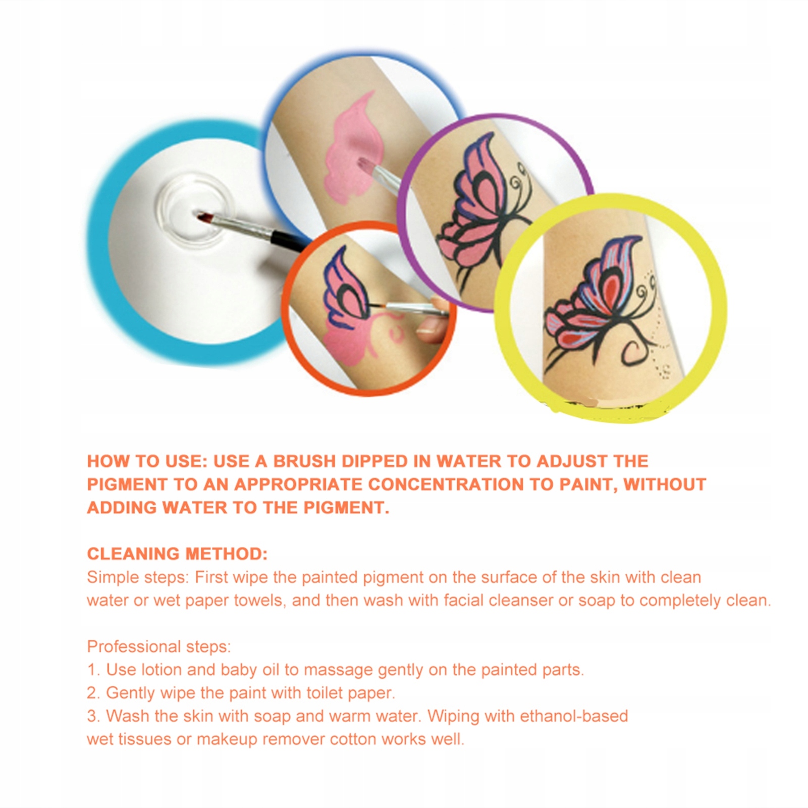 1, подходящие как для окраски лица, так и для тела, вода -солупируемого пигмента, легко чистка.