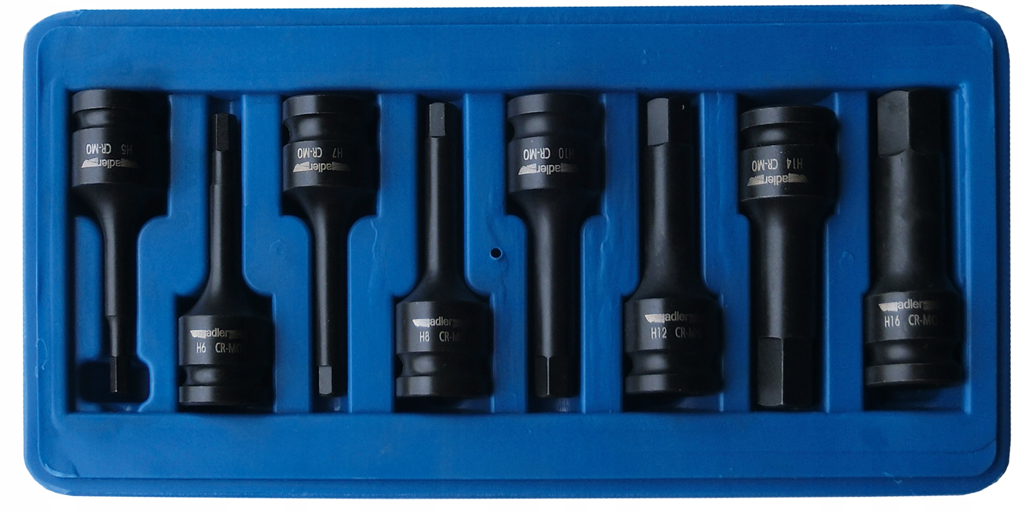 Набор шестигранных головок (ШЕСТИГР. ) ударные головки с хвостовиком 1/2". Набор расположен в прочном пластиковом кейсе и содержит 8 шестигранных ударных головок из сплава хром-молибденовой стали.