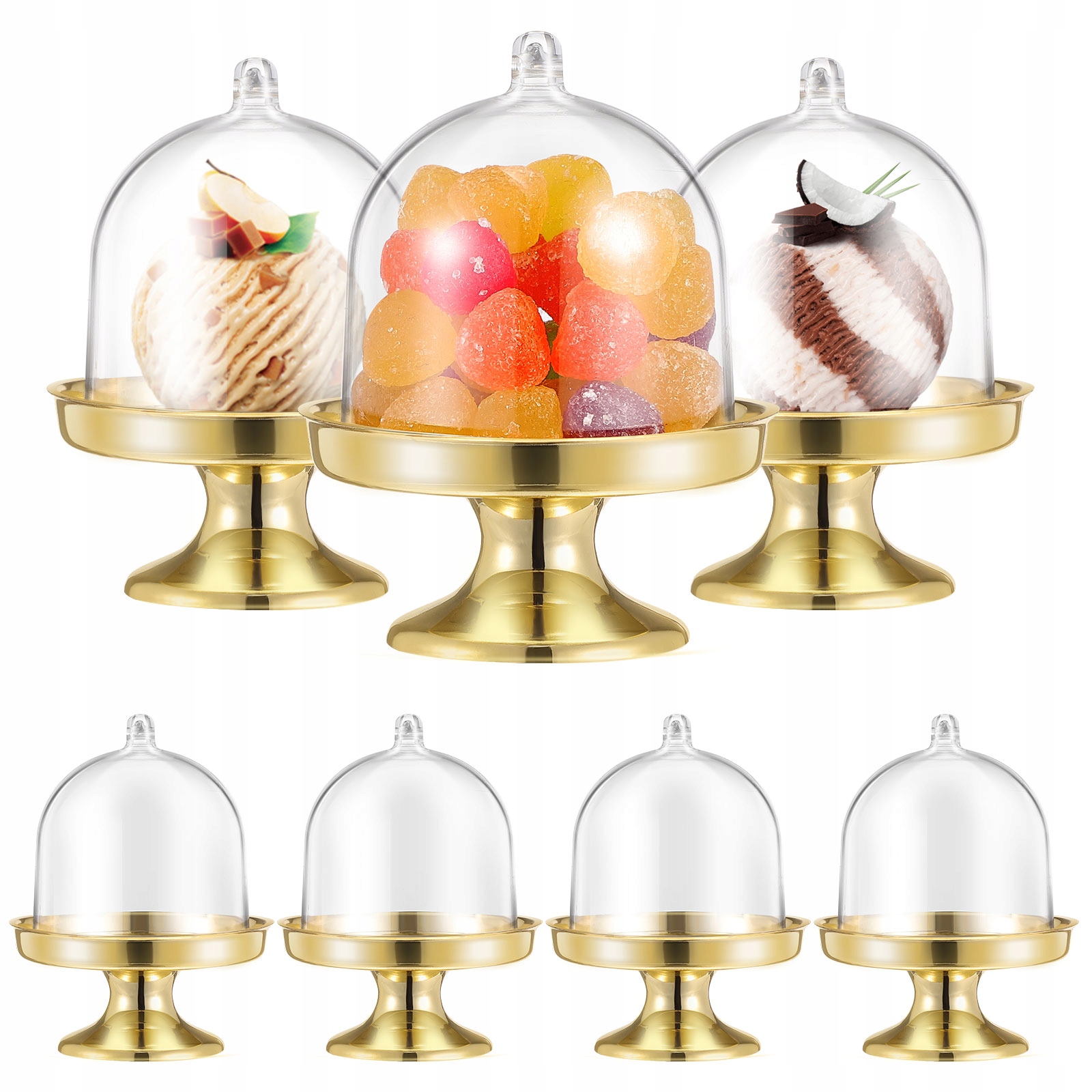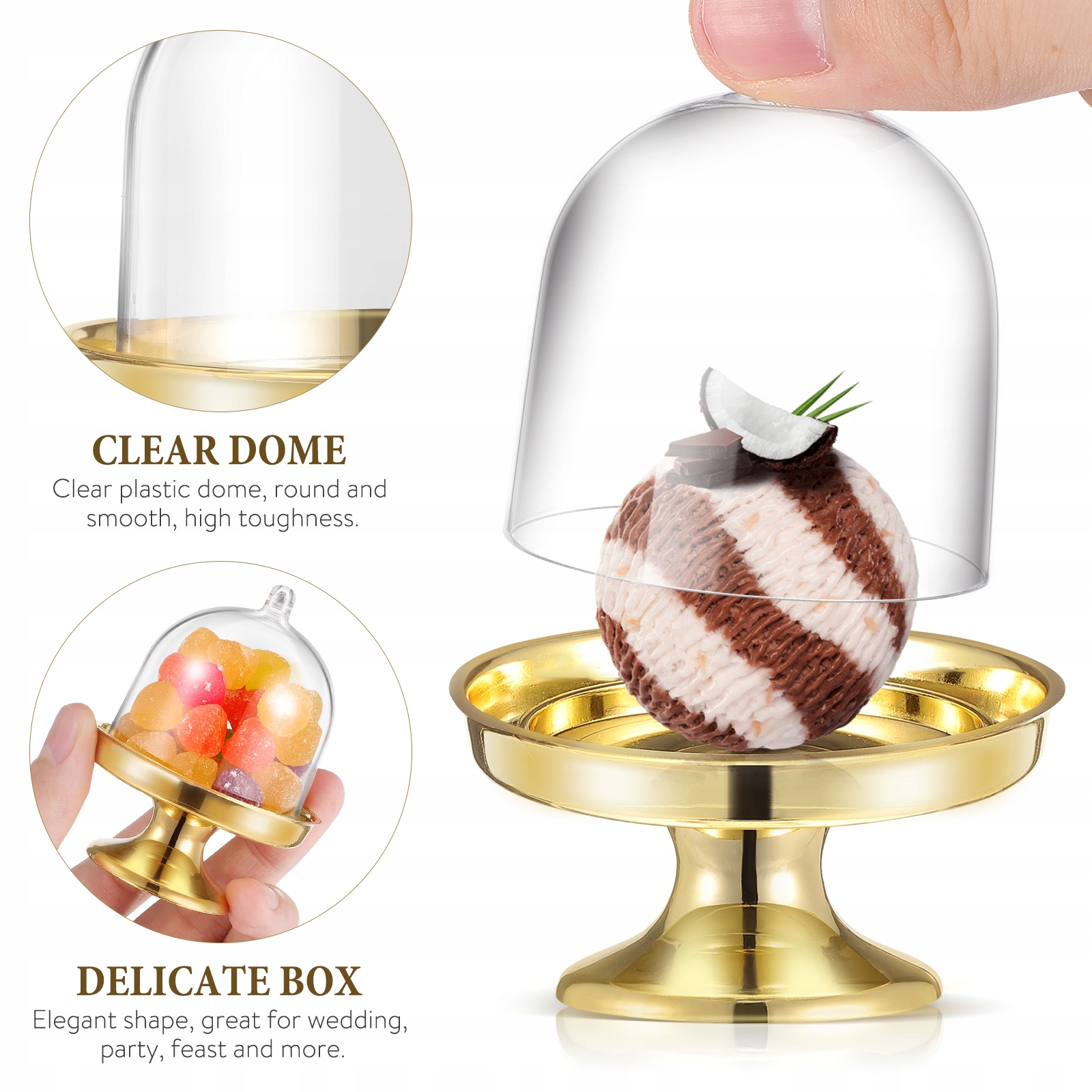 Это набор мини-пластиковых коробочек куполообразной формы для тортов или конфет. Защитите свой вкусный десерт и придайте ему потрясающий вид. Отлично подходит для всех видов маленьких тортов, конфет, печенья и многого другого. Идеальный аксессуар для вечеринки или свадьбы. Вы получите много комплиментов за свои творческие идеи.