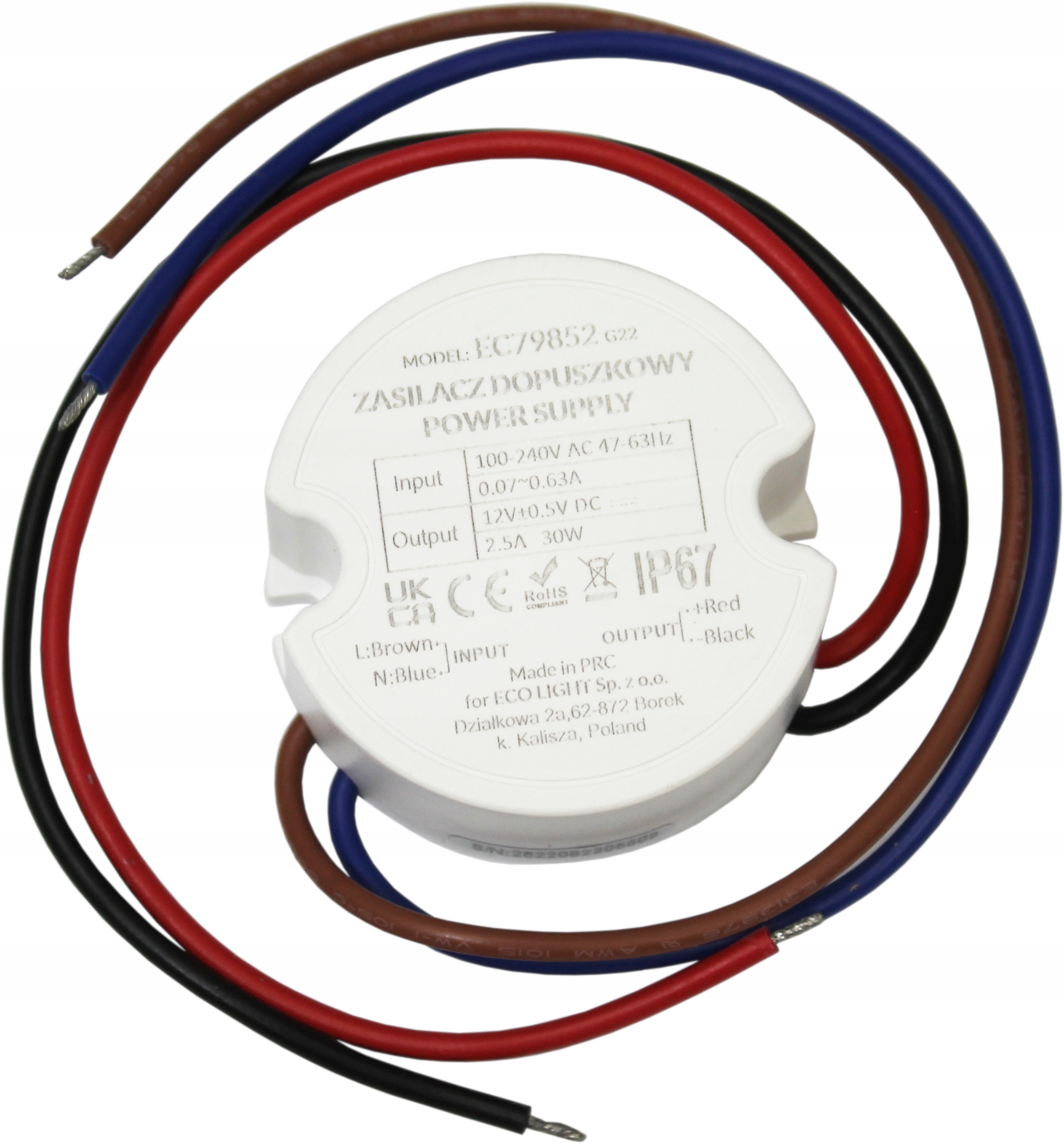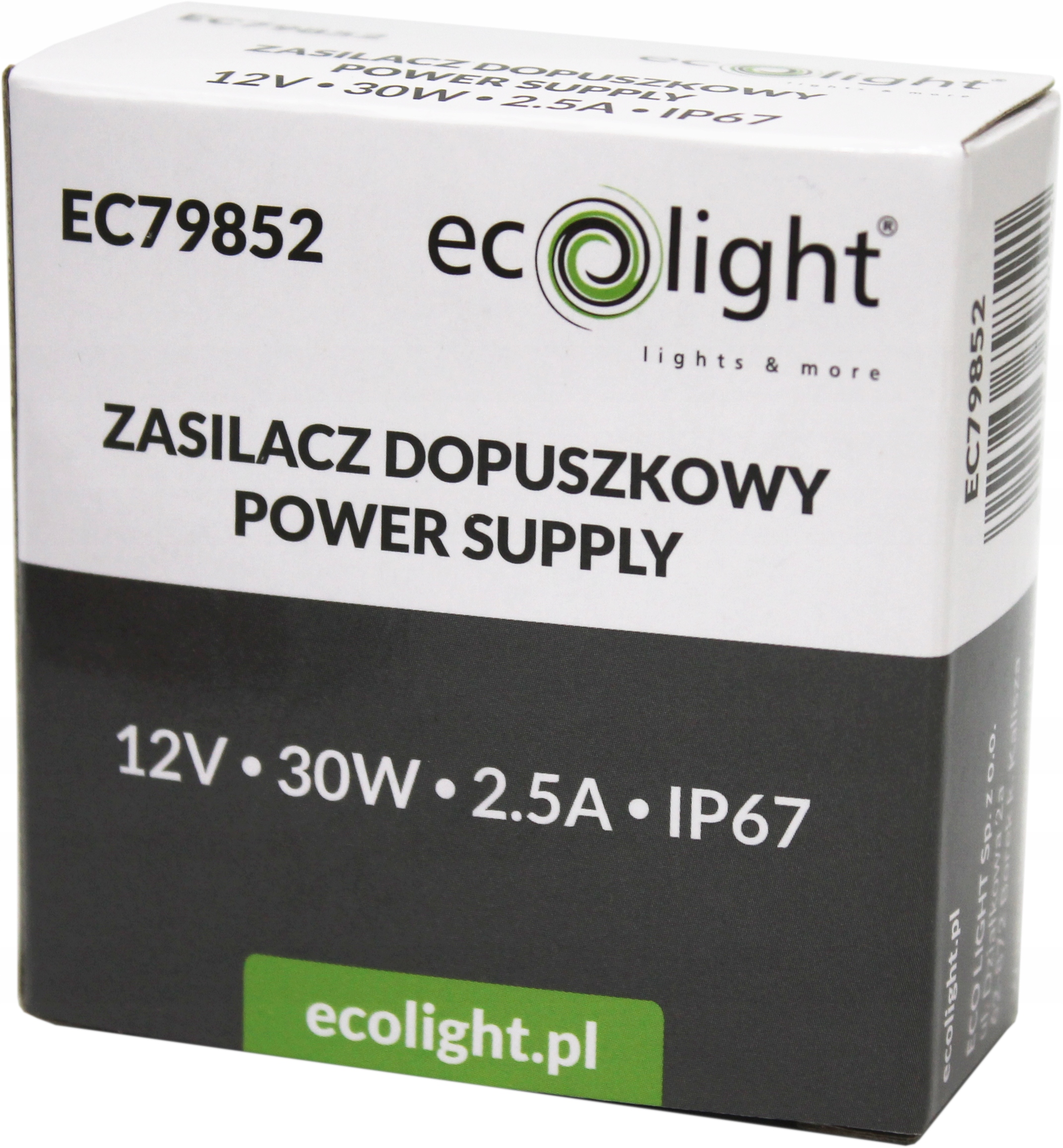 Блок питания для светодиодов, встраиваемый в стену, 30 Вт, 12 В, 2,5 А, IP67 EC79852 EcoLight. Компактная модель, предназначенная для всех типов светодиодных светильников. Небольшие размеры (50x50x20 мм) позволяют устанавливать его в распределительной коробке. Благодаря этому мы экономим пространство и улучшаем эстетику светодиодного освещения. Блок питания E C79852 предназначен для установки внутри помещения. Работает при входном напряжении 100-240 В переменного тока. Уровень герметичности данной модели IP67 – поэтому ее можно устанавливать в местах, подверженных воздействию влаги. Данная модель рассчитана на работу с освещением мощностью до 30Вт.