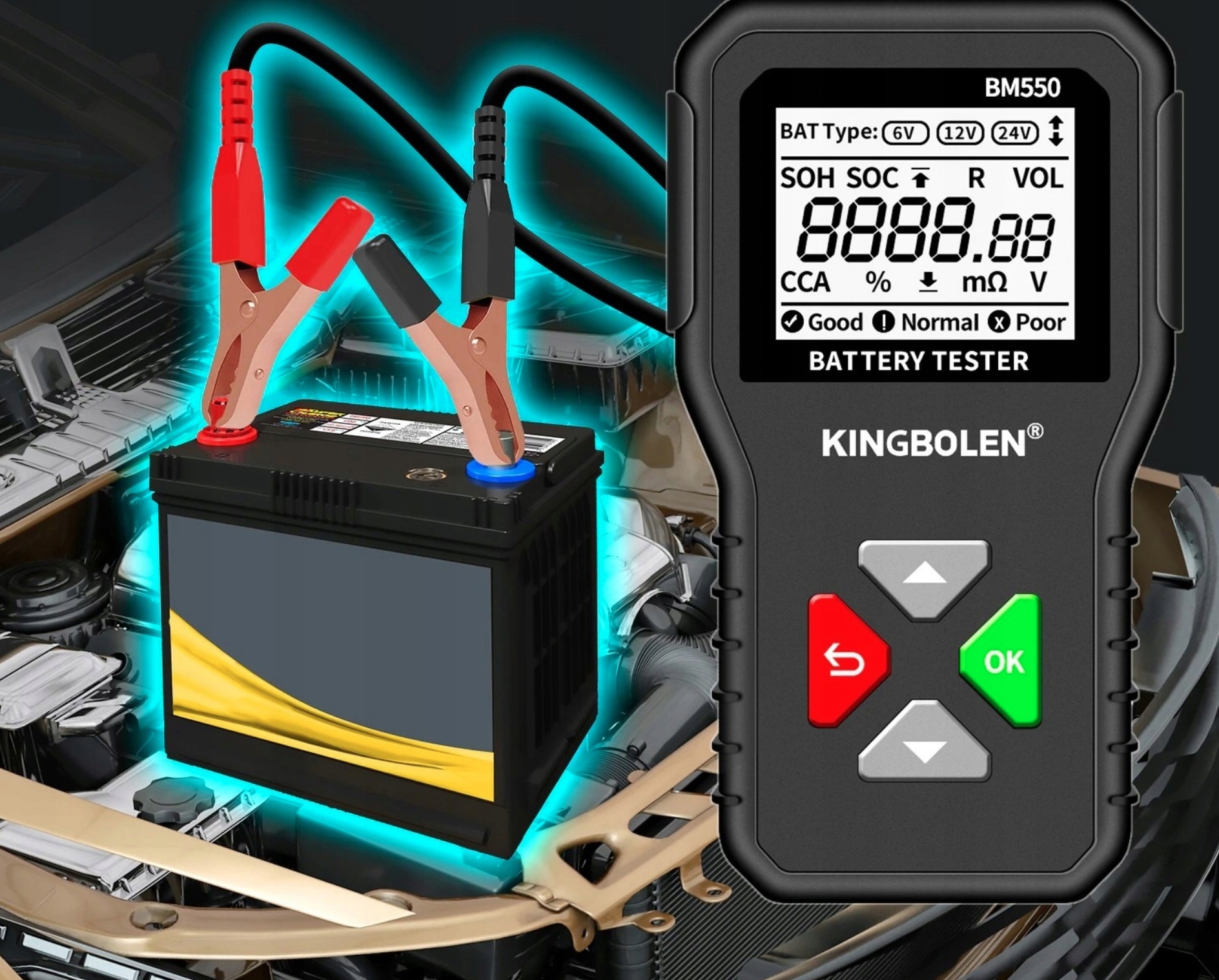 Тестер включает автоматически, после того, как правильно соединит зажимы аккумулятора.